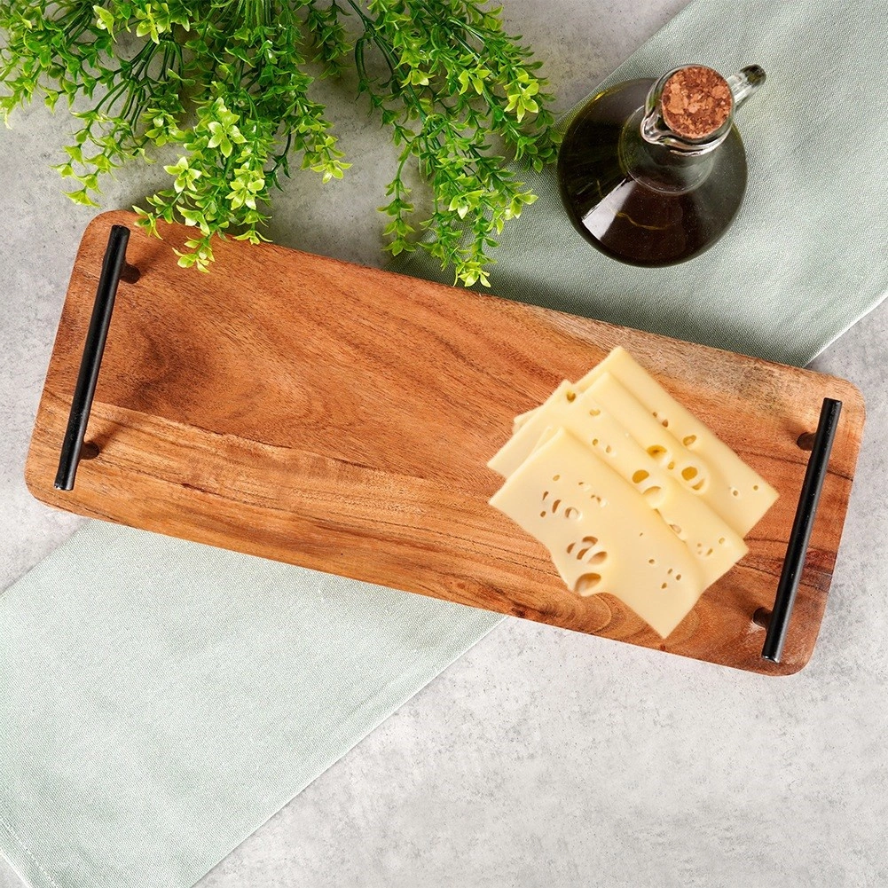 Elegáns tálalódeszka akácfából fekete fém fogantyúkkal a könnyű hordozásért. Ideális sajtokhoz, előételekhez, desszertekhez és reggelihez, remek választás otthonra és vendéglátásba egyaránt. Természetes fa ipari stílusban, amely egyedivé teszi a terítést. Méretek: 40 × 15,5 × 5 cm.