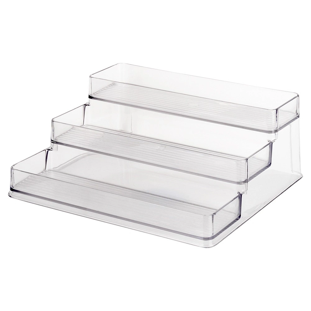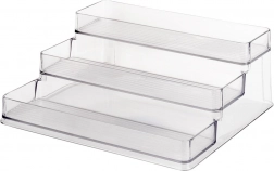 Ez az univerzális, háromszintes rendszerező polc átlátszó műanyagból azonnal javítja a rendet és az átláthatóságot a konyhában, a fürdőben vagy a kamrában. Az átlátszó anyag lehetővé teszi a kívánt hozzávaló vagy kozmetikum gyors megtalálását, míg a lépcsőzetes kialakítás helytakarékos és növeli a kapacitást.