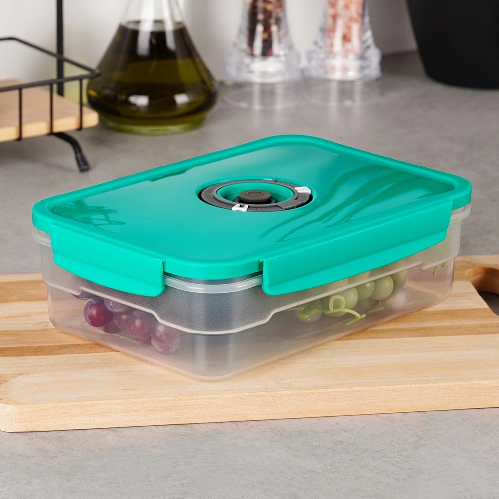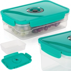 Praktikus, 1,2 l űrtartalmú vákuumos doboz, amely a nagy hatékonyságú levegőkiszívásnak és a légmentes záródásnak köszönhetően tovább frissen tartja ételeit. Négy biztonságos klippel, dátumbeállítós szeleppel rendelkezik, és BPA-mentes műanyagból készült. Mosogatógépben, fagyasztóban és mikrohullámú sütőben (fedél nélkül) is használható.