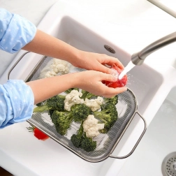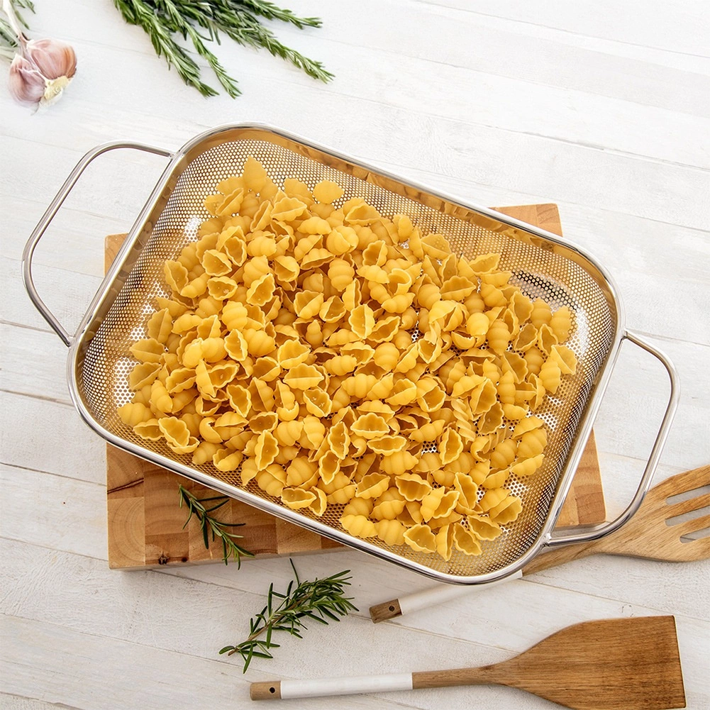Az apró hálós szerkezet hatékonyan vezeti el a vizet, miközben a kisebb élelmiszerdarabokat is bent tartja – ideális zöldséghez, tésztához vagy rizshez.