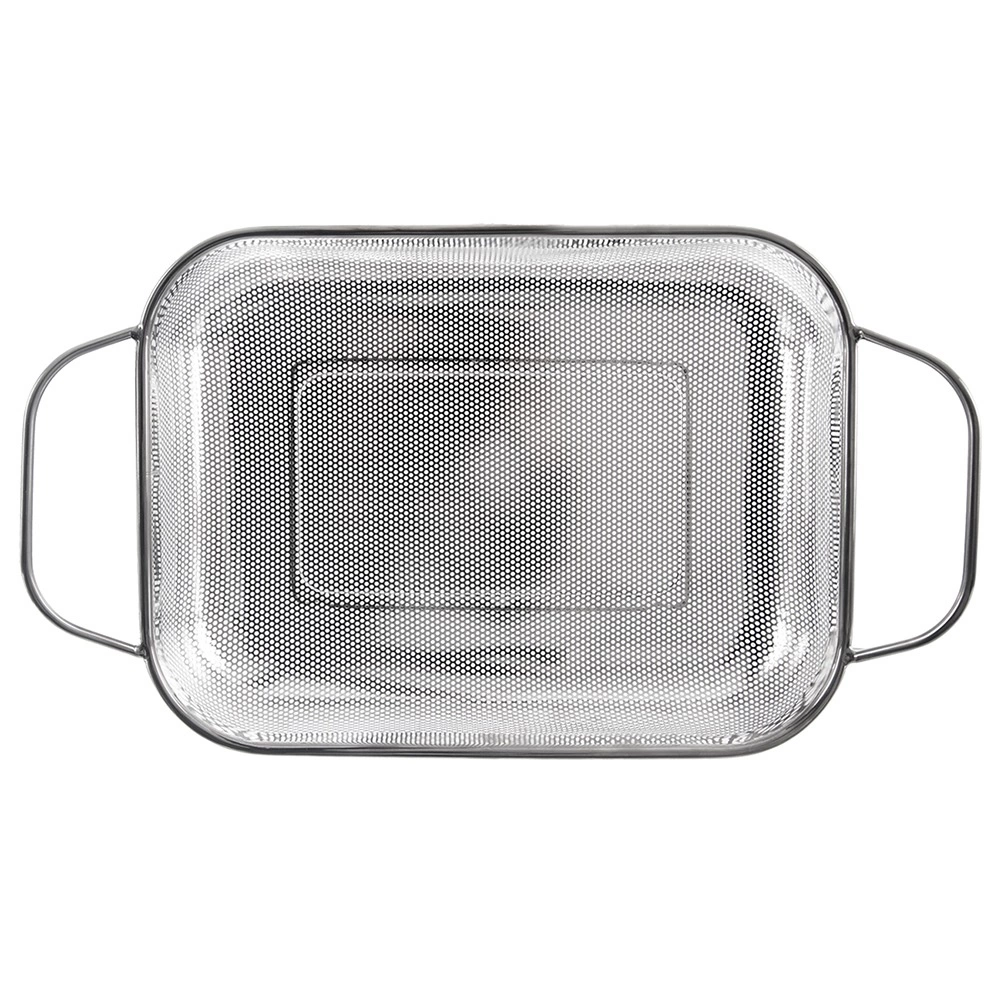 Praktikus, téglalap alakú rozsdamentes acél szűrő/csepegtető kosár stabil lábakkal és két fogantyúval a kényelmes hordozáshoz. Ideális gyümölcs és zöldség mosásához, tészta vagy rizs leszűréséhez, valamint grillkosárként zöldséghez, halhoz vagy kisebb húsdarabokhoz. A finom perforációnak köszönhetően gyorsan elvezeti a vizet, magas hőmérsékletnek ellenáll, és mosogatógépben mosható.