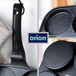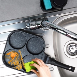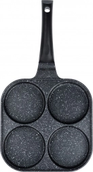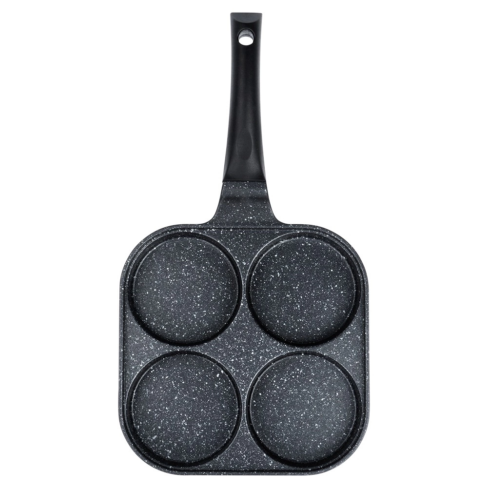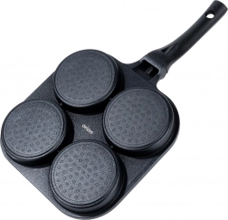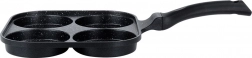A 22 × 22 cm-es, négy külön kamrával rendelkező, négyzet alakú serpenyő egységes adagméretet és tökéletes reggeli megjelenést biztosít. Az alumínium test gránit tapadásmentes réteggel gyorsan felmelegszik és kiválóan vezeti a hőt, így gyorsan, takarékosan és leégés nélkül süthet. Az ergonomikus, csúszásmentes, akasztólyukkal ellátott nyél kényelmes és biztonságos használatot nyújt.