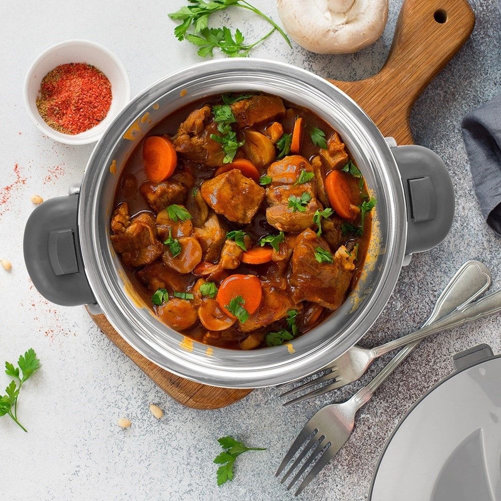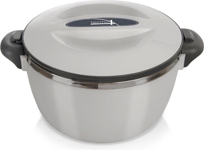 Tartsa a leveseket, főételeket és desszerteket ideális hőmérsékleten a masszív 2 l-es rozsdamentes termosztállal. A rozsdamentes acél belső rész könnyen tisztítható, a külső, ellenálló műanyag pedig véd az égési sérülésektől és kényelmes fogást ad. A fedél egyszerű elfordítással zárható, a oldalsó fogantyúkkal együtt pedig biztonságos szállítást garantál.