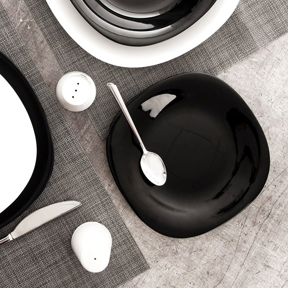 Elegáns LUNA desszerttányér 20,5 × 20,5 cm-es méretben, modern fekete színben, opálüvegből. A lekerekített sarkú négyzetes forma, az enyhén megemelt perem és a fényes felület ideálissá teszi desszertek, sütemények és snackek tálalásához. Mosogatógépben és mikrohullámú sütőben is használható, tökéletes a mindennapokra és az ünnepi terítékhez is.