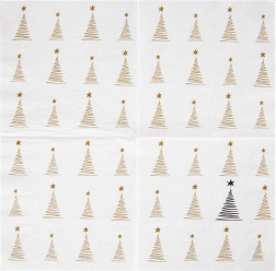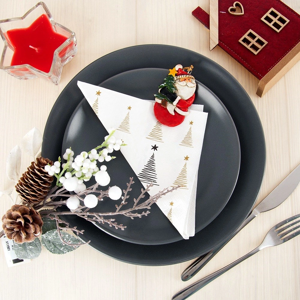 - Ünnepi dizájn – fehér szalvéták arany fenyőmintával a meghitt hangulatért.