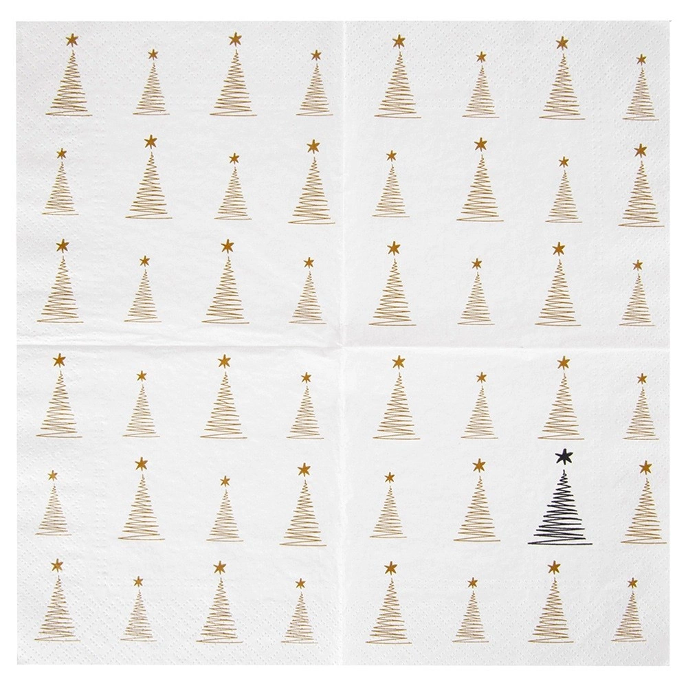 Varázsoljon ünnepi hangulatot az asztalára ezekkel a fehér papír szalvétákkal arany fenyőmintával. A 3 rétegű szerkezetnek köszönhetően kellemes tapintásúak, erősek és megbízhatóan felszívják a folyadékot. Kiterítve 33 × 33 cm (összehajtva 16,5 × 16,5 cm) méretűek, így főfogáshoz és desszerthez egyaránt megfelelnek.