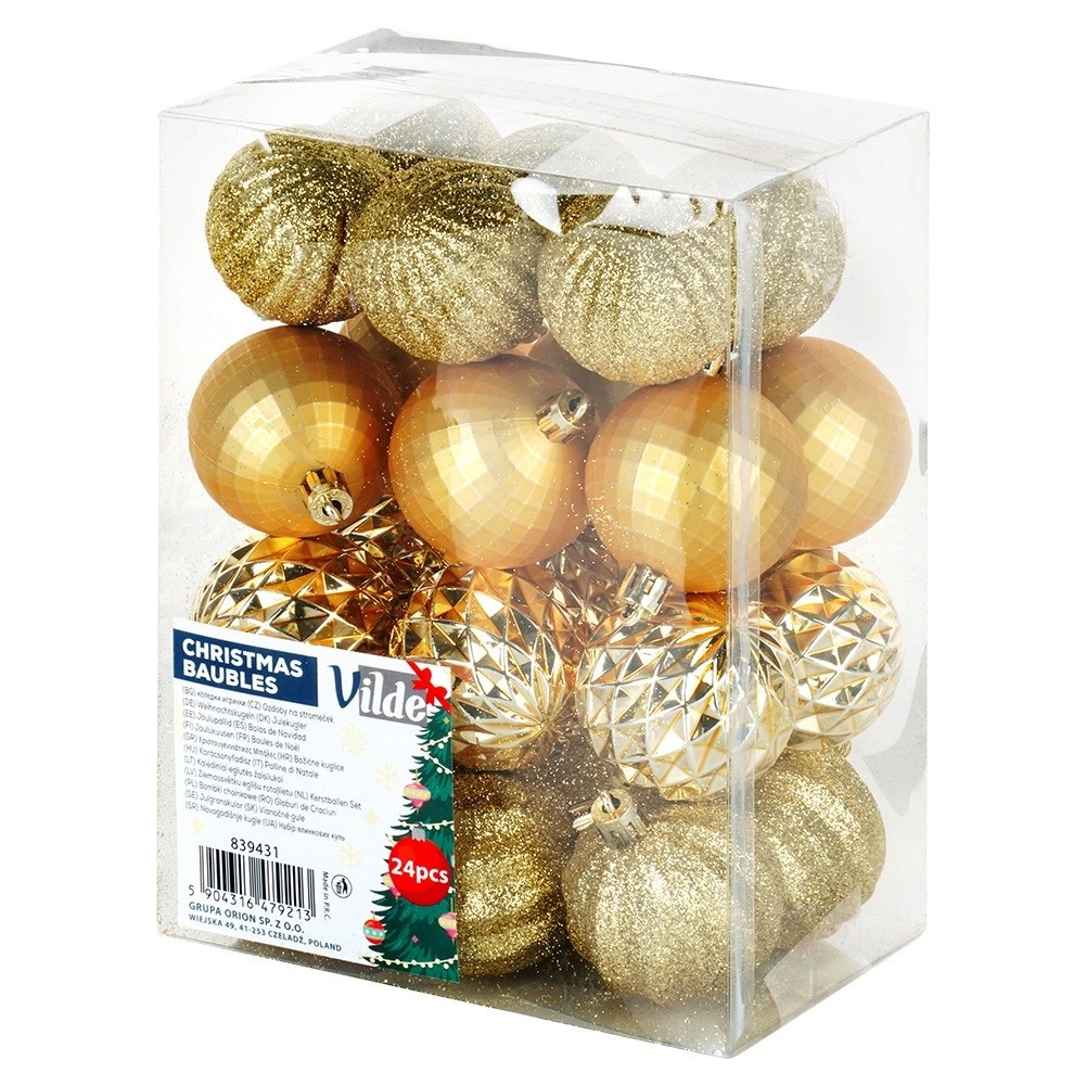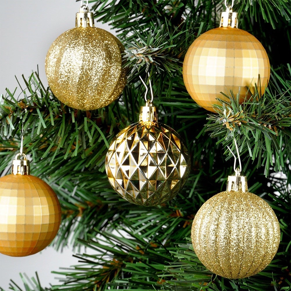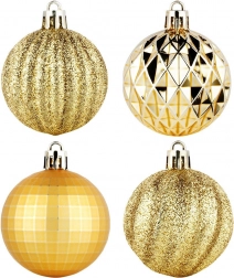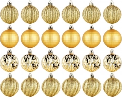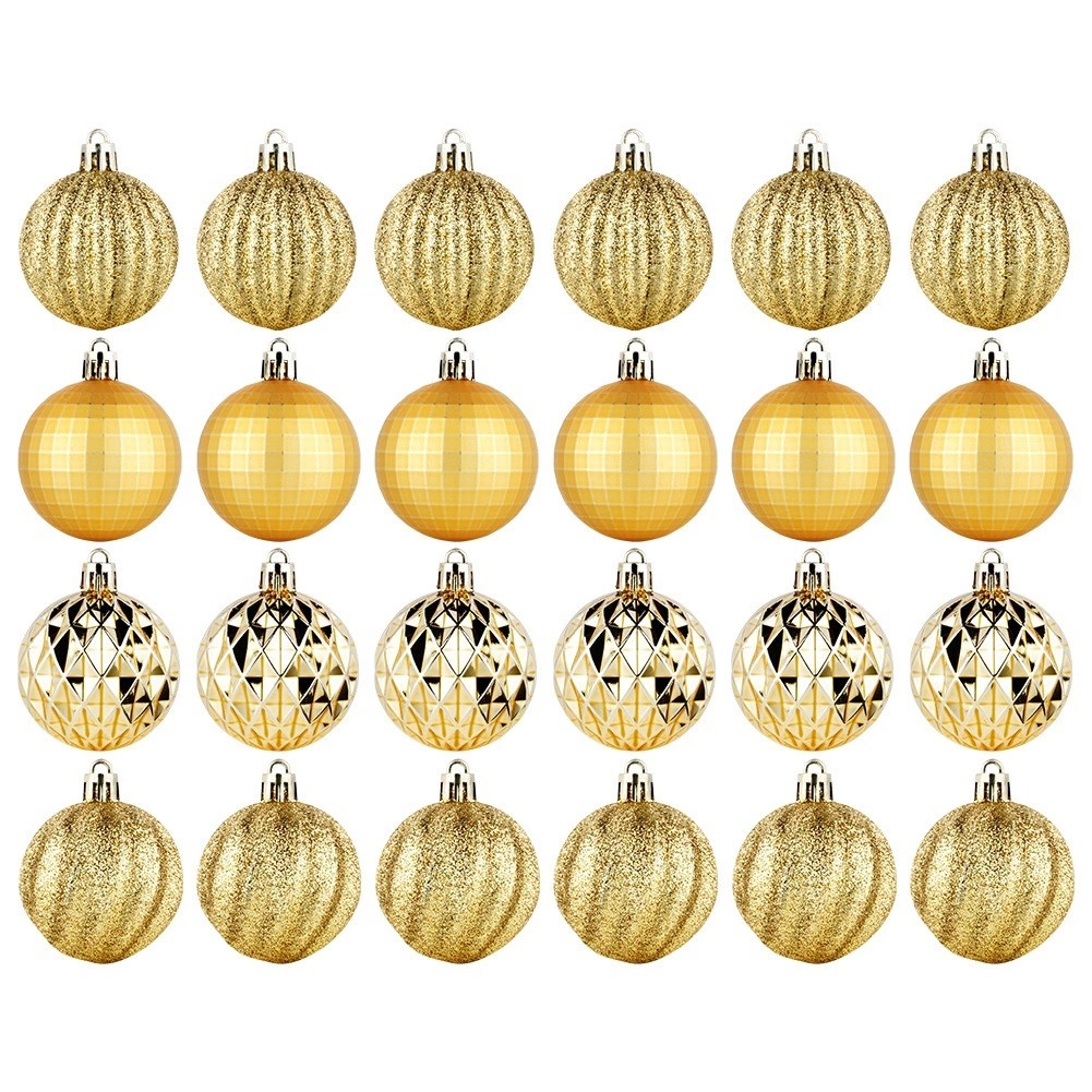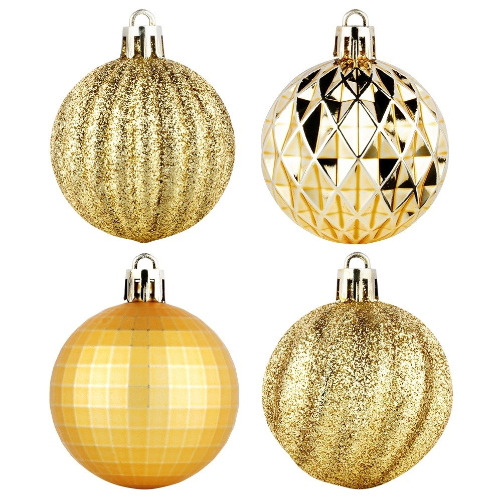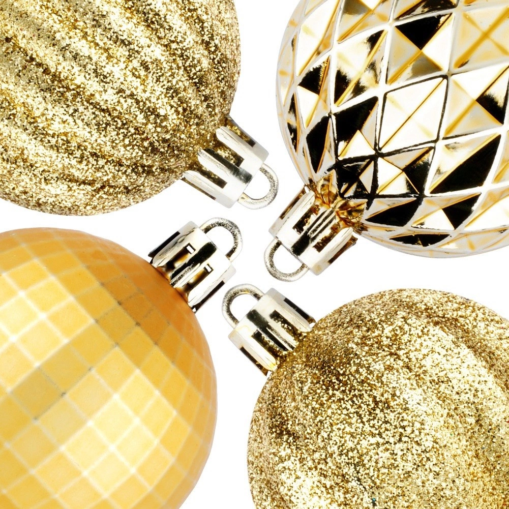Elegáns 24 darabos arany karácsonyi gömb készlet 5 cm átmérővel, különböző felületkialakításokkal – fényes, matt, brokát és strukturált. Törhetetlen műanyagból készült a nagyobb biztonság érdekében gyermekekkel és háziállatokkal élő otthonokba, a csomagban mellékelt zsinórokkal a könnyű felakasztáshoz.