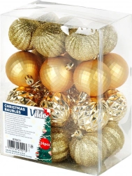 A csomag 24 darab, 5 cm átmérőjű gömböt és zsinórokat tartalmaz a fa, koszorúk és girlandok gyors és egyszerű díszítéséhez.