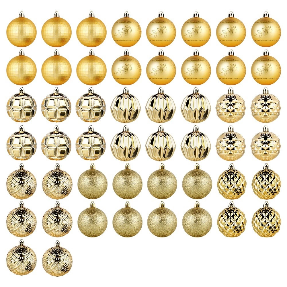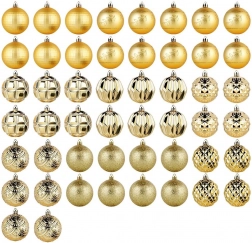 Elegáns 50 darabos arany karácsonyi dísz 6 cm átmérővel, amely klasszikus fényt és ünnepi hangulatot ad dekorációdnak. A díszek törhetetlenek, könnyűek és biztonságosak gyermekekkel vagy háziállatokkal élő otthonokba, vegyes felületű kivitelben – fényes, matt, csillogó, domborított.
