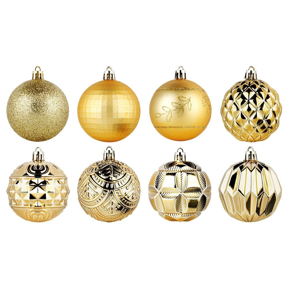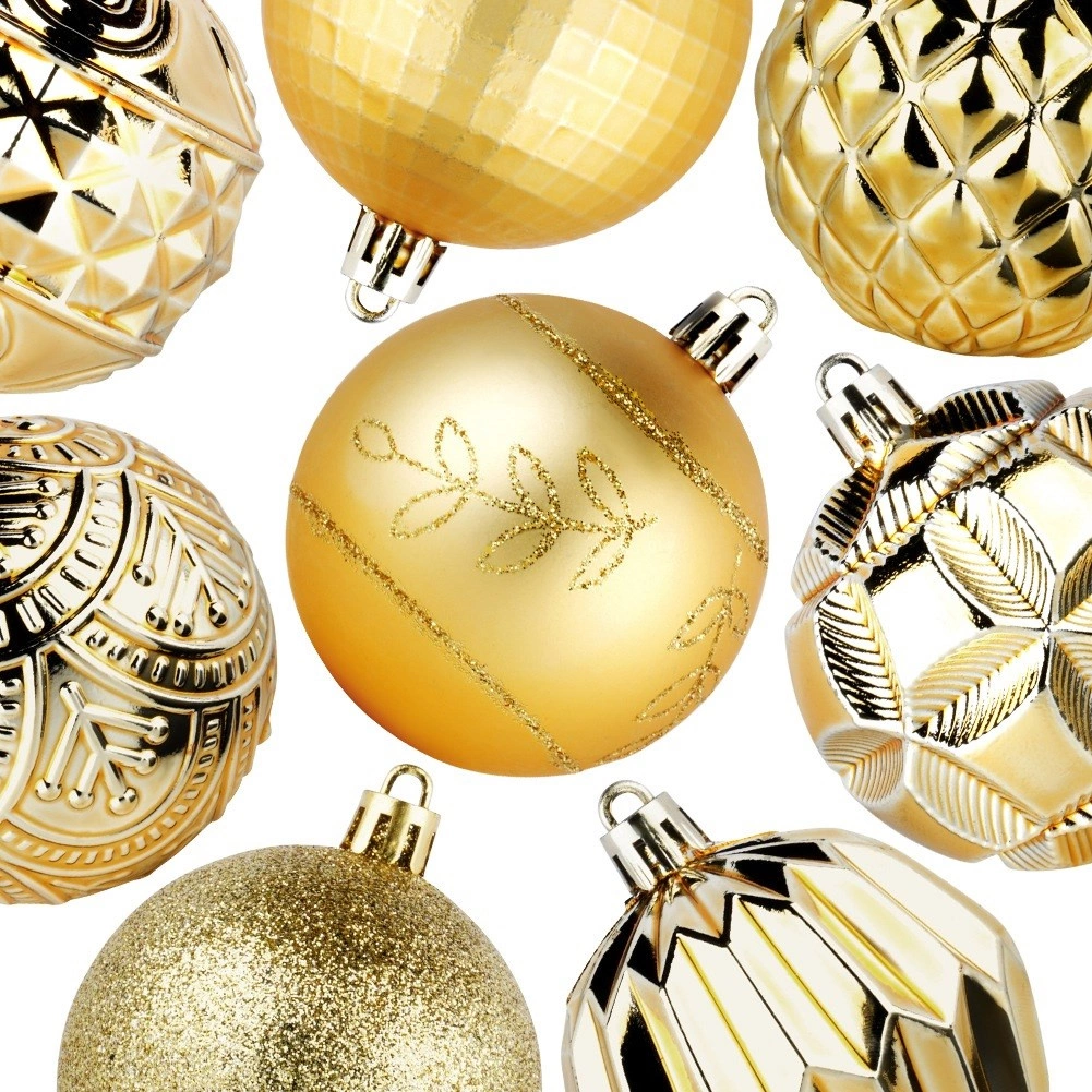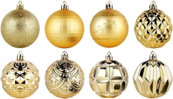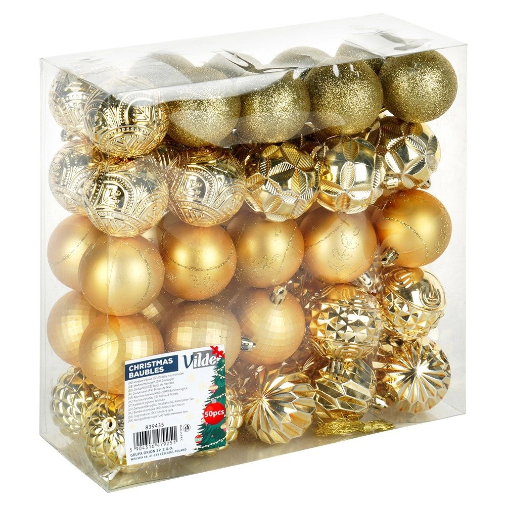 Varázslatos karácsonyi dekorációt alkothatsz az egységes arany árnyalatú, 50 darabos gazdag készlettel. A díszek luxushatást keltenek, és a különböző textúrák, dekorok mélységet és ragyogást adnak a fának és kompozícióknak. Tartós anyagból készültek, amely üvegre hasonlít, de biztonságosabb és időtállóbb.