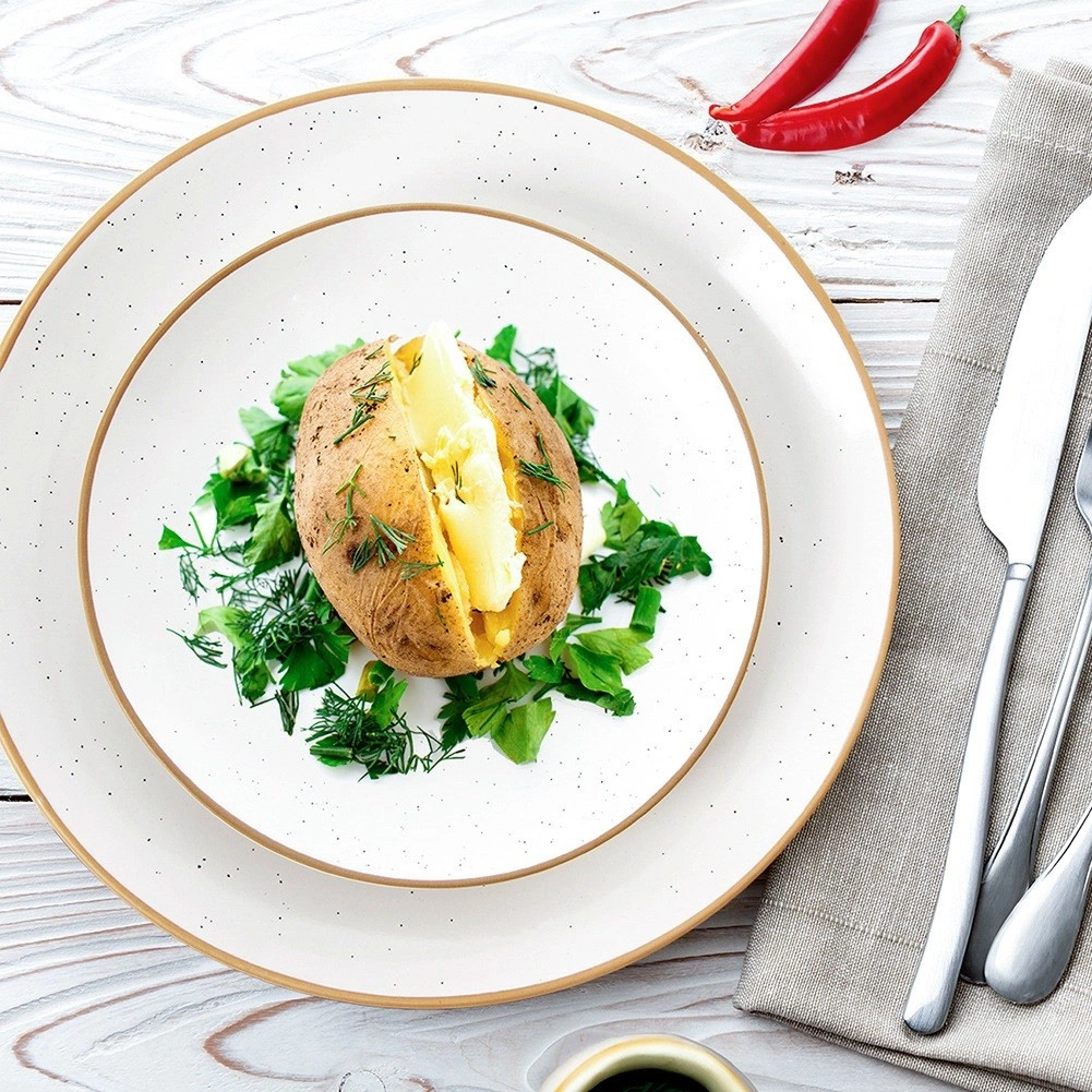 - Modern megjelenés: bézs, pettyezett máz rusztikus peremmel, amely kiemeli a teríték karakterét.