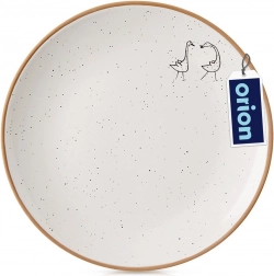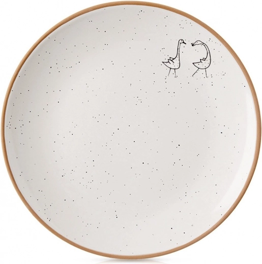 Stílusos, 20 cm átmérőjű desszertes tányér minőségi kerámiából, bézs színben finom pöttyözéssel és természetes kőedény peremmel. Remek választás torták, desszertek és apró finomságok tálalásához, otthon és étteremben egyaránt. Mosogatógépben mosható és mikrohullámú sütőben használható, klasszikus kerek formájú, valamint látványos dizájnnal, visszafogott, libamotívumos domborítással.
