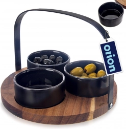 Elegáns készlet három kerámia tálkával kerek akáciifa tálcán, praktikus fém fogantyúval a könnyű hordozáshoz. Ideális mártásokhoz, szószokhoz, olívabogyóhoz vagy magvakhoz, a tálkák minőségi kerámiából készülnek és mosogatógépben moshatók. A tálcán kimart pozíciók biztosítják a stabilitást, az egész szett pedig remek asztaldekoráció és ajándék.