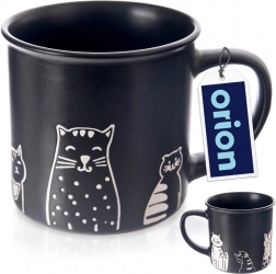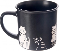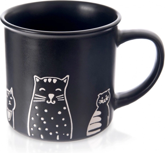 Stílusos, matt fekete 500 ml-es kerámia bögre játékos macskamotívumokkal, ideális kávéhoz, teához és kakaóhoz. Kényelmes füllel rendelkezik, mosogatógép- és mikrohullámú sütő-kompatibilis, a minőségi kerámiának köszönhetően bírja a mindennapi használatot.