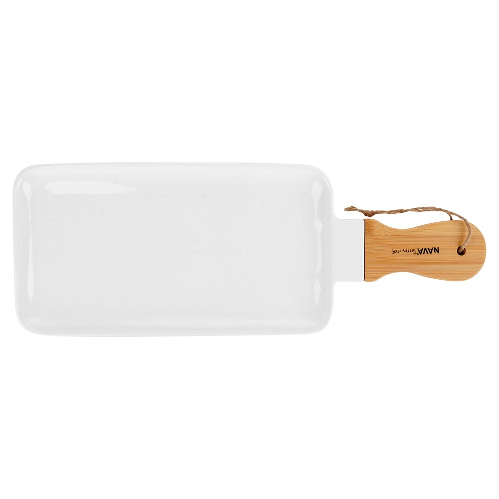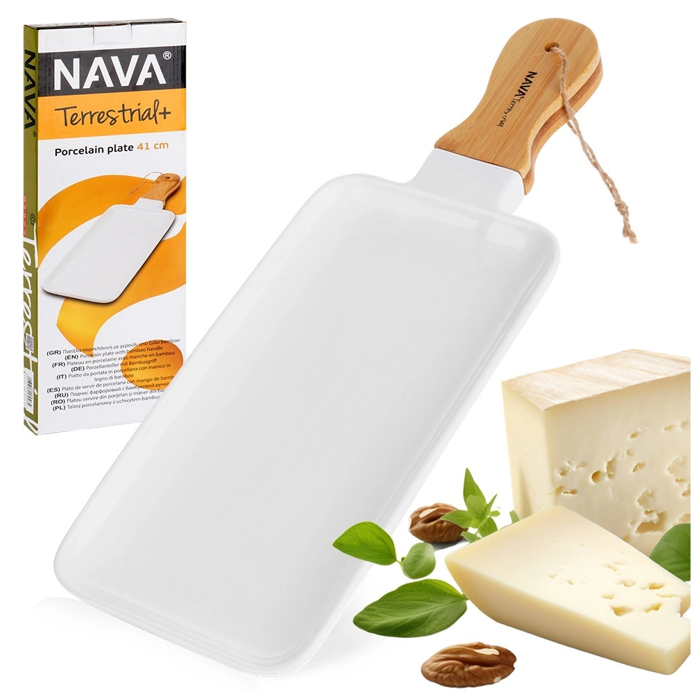 A NAVA TERRESTRIAL porcelán szervírozótányér időtlenül fehér porcelánt ötvöz a meleg tónusú bambusszal. A sima, mázas felület ideális stílusos tapasok, sajtok, desszertek vagy gyümölcsök tálalásához, míg az ergonomikus nyél szemmel és zsinórral könnyű hordozást és felakasztást tesz lehetővé kampóra.
