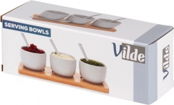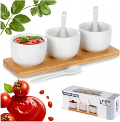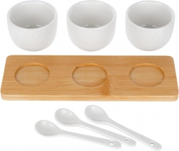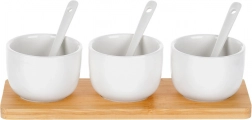A tálcán elhelyezett három tálka kanalakkal helytakarékos megoldás, és lehetővé teszi többféle finomság áttekinthető, egy helyen történő tálalását.