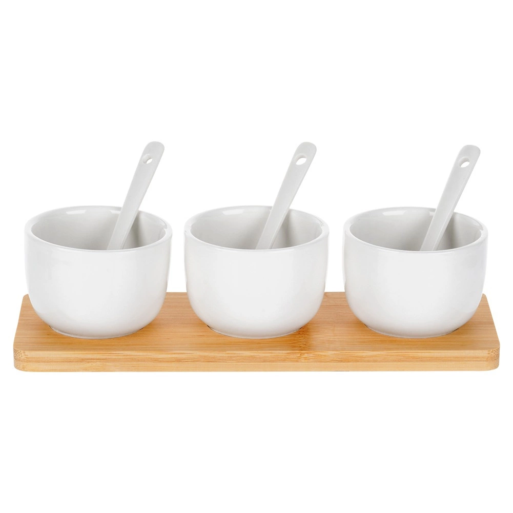 Ez a 7 részes készlet a minimalista dizájnt és a praktikus részleteket ötvözi a mindennapi étkezésekhez és ünnepi alkalmakhoz egyaránt. A három sima, fehér kerámia tálka (90 ml) precízen mart mélyedésekben ül a bambusz tálcán, így szállítás közben sem mozdul el. A kényelmes szervírozást harmonizáló kerámia kanalak egészítik ki.