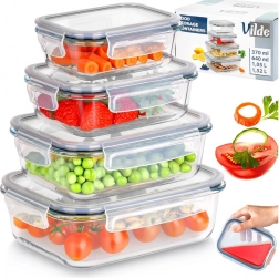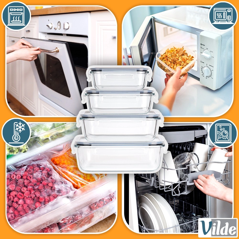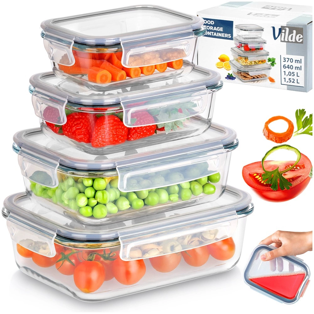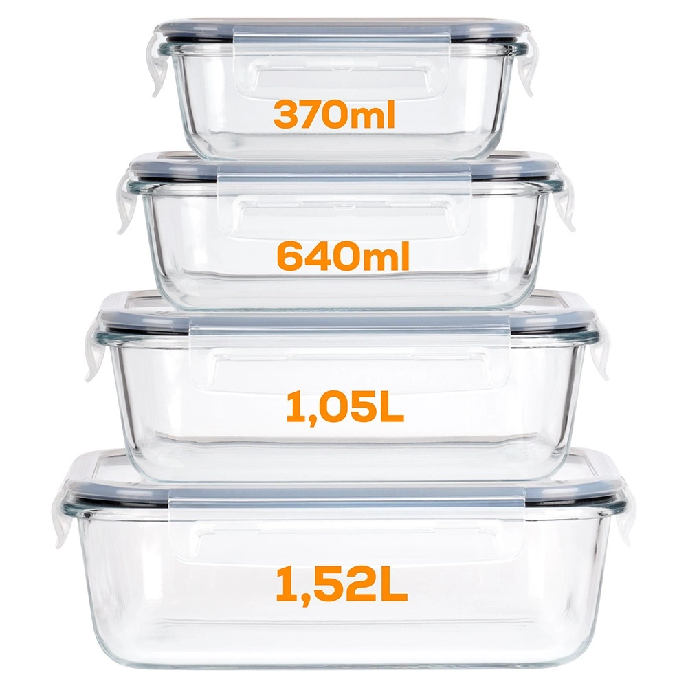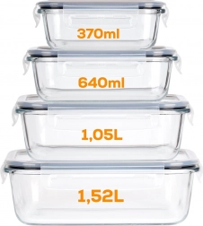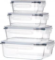 Négy darab boroszilikát üvegből készült ételtároló doboz légmentesen záródó fedelekkel és négy klippel a biztonságos záráshoz, hogy az étele tovább friss maradjon. A különböző méreteknek és az egymásba helyezhető kialakításnak köszönhetően helytakarékosak, így ideálisak hűtőszekrénybe, fagyasztóba, mikrohullámú sütőbe és sütőbe is. Légmentes zárás, tartós boroszilikát üveg, használható sütőben és mikrohullámú sütőben (fedél nélkül), valamint könnyű tisztítás mosogatógépben.