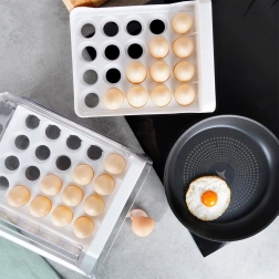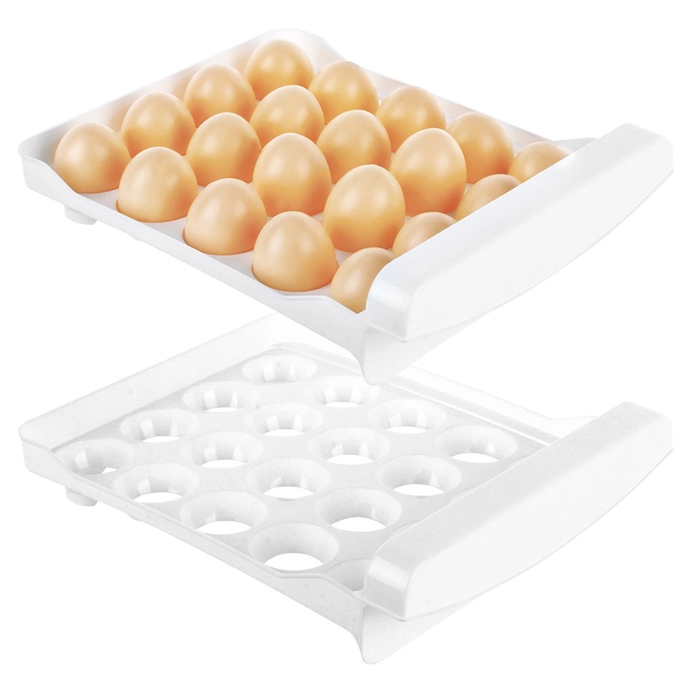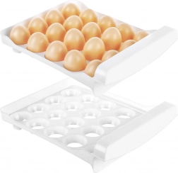 Tartson rendet a hűtőben a 40 darabos kapacitású, kétszintes tojástárolóval (szintenként 20 db). Az átlátszó fedél és a fehér betétek speciális fészkeikkel megakadályozzák a tojások gurulását, és stabilan tartják őket. Az okos megoldásnak köszönhetően a tojások jobban védettek a sérülésektől, és tovább maradnak frissek.