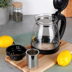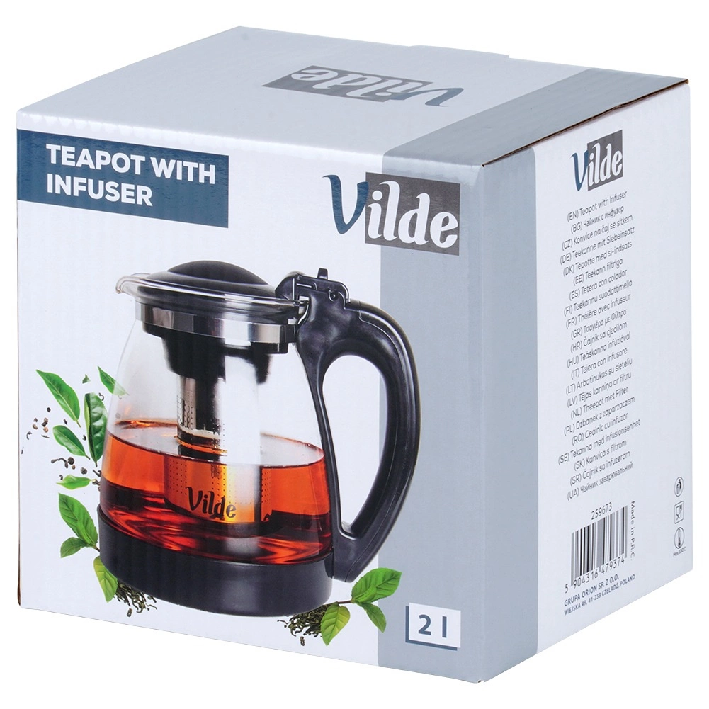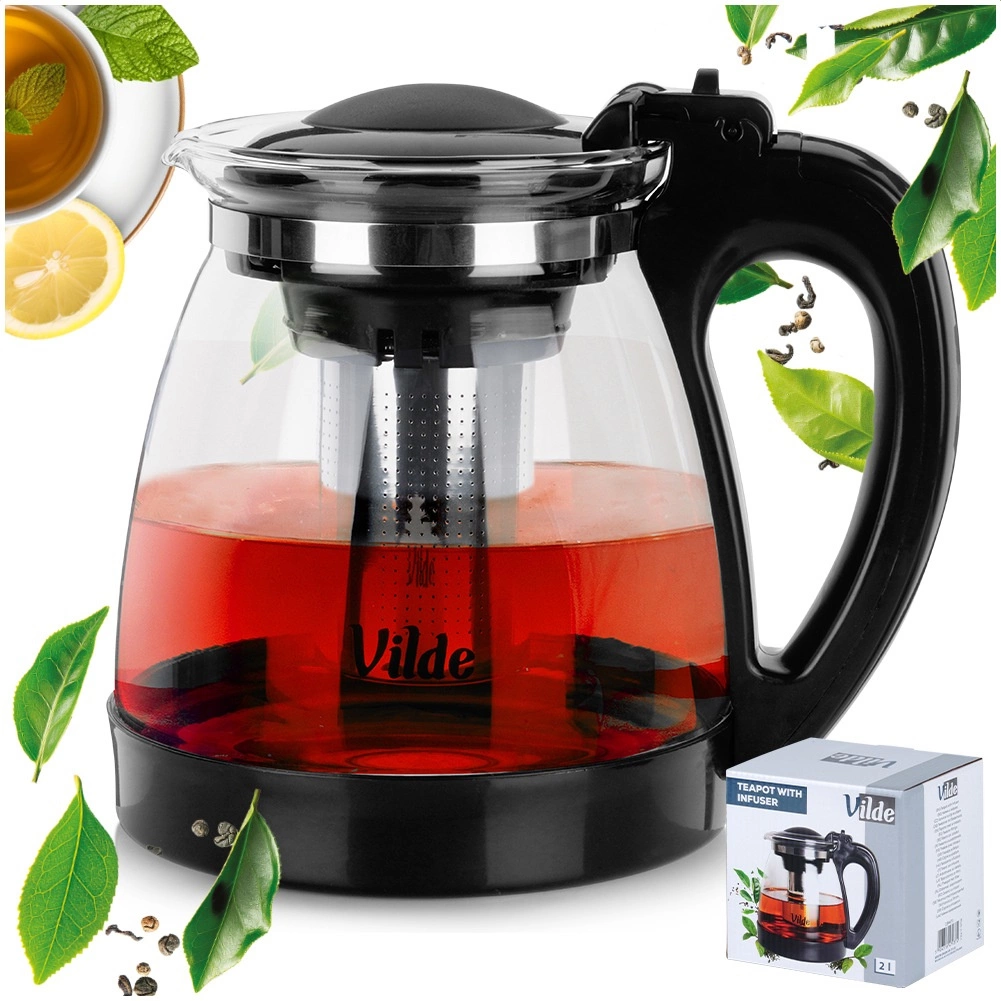 Elegáns, 2 literes üveg teáskanna kivehető rozsdamentes acél infúzorral szálas teához és gyógynövényekhez. Tartós boroszilikát üvegből, kényelmes fogással, felnyitható tetővel és pontos kiöntőcsőrrel. Ideális zaccmentes tea, forró és hideg italok készítéséhez és könnyű tálaláshoz.