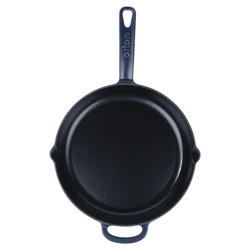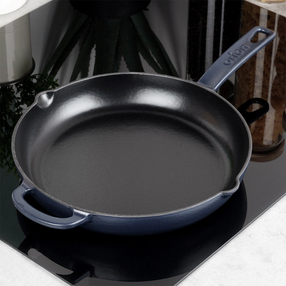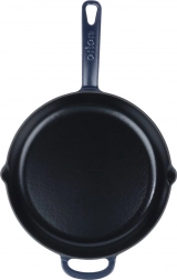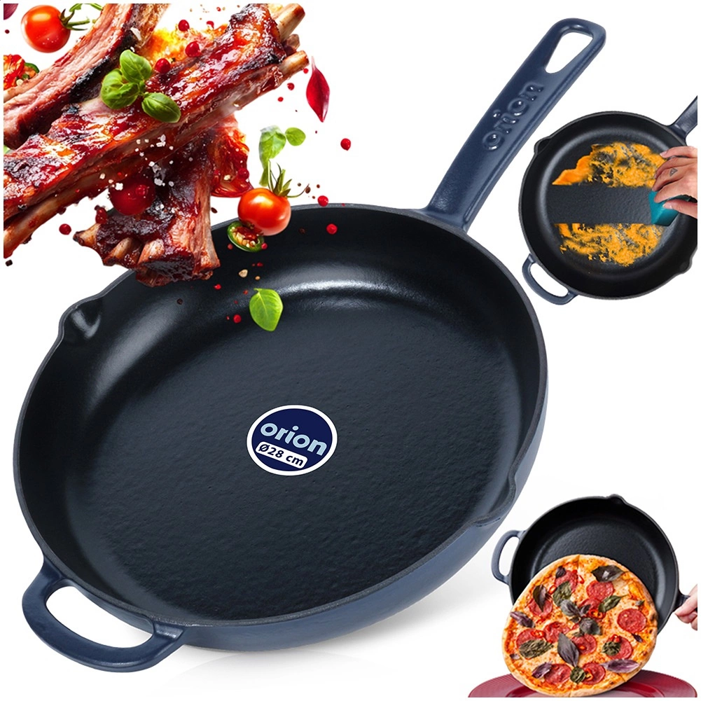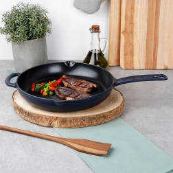 Robusztus, 28 cm átmérőjű öntöttvas serpenyő fekete, zománcozott belsővel és kék külsővel, amely egyenletes hőelosztást, hosszú hőtartást és széles kompatibilitást kínál minden tűzhelytípushoz, beleértve az indukciót is. A két kiöntőcsőrnek és a kettős fogásnak köszönhetően ideális sütéshez, pirításhoz és tálaláshoz közvetlenül az asztalnál.