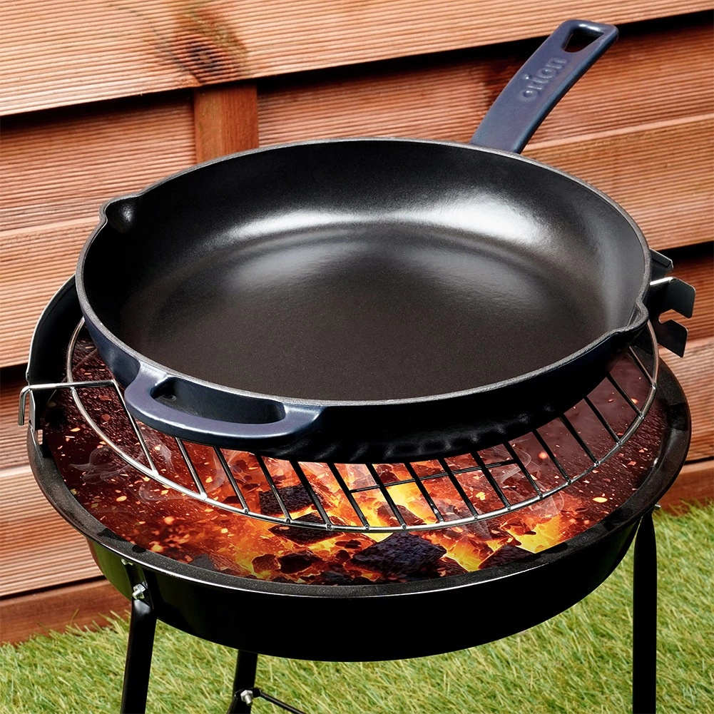 Ez a sokoldalú öntöttvas serpenyő kiváló sütéshez, pirításhoz, pároláshoz és sütőben sütéshez. A tartós felépítés és a zománcozott felület megkönnyíti az ételek elkészítését és a későbbi tisztítást. A serpenyő hosszú ideig tartja a magas hőmérsékletet, ami tökéletes steakekhez, zöldségekhez, burgonyához és pizzához. Alkalmas konyhában, grillen és nyílt tűznél is.