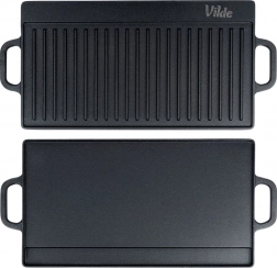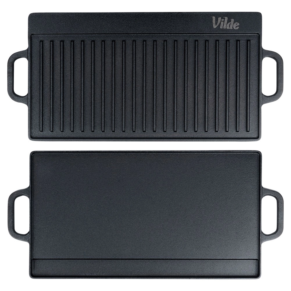 Fedezze fel a CAST LINE öntöttvas lap sokoldalúságát: az egyik oldal sima palacsintához, tojásokhoz vagy tengeri herkentyűkhöz, a másik bordázott, hogy markáns grillcsíkokat adjon steakeknek, zöldségeknek és kolbászoknak. A masszív öntöttvas kiváló hőtárolást és a teljes felület egyenletes felmelegedését biztosítja, ami szaftos eredményt ad minimális leégés mellett.