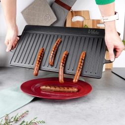 Sima felület sütéshez és palacsintához, bordázott oldal markáns grillcsíkokhoz és a felesleges zsír elvezetéséhez.