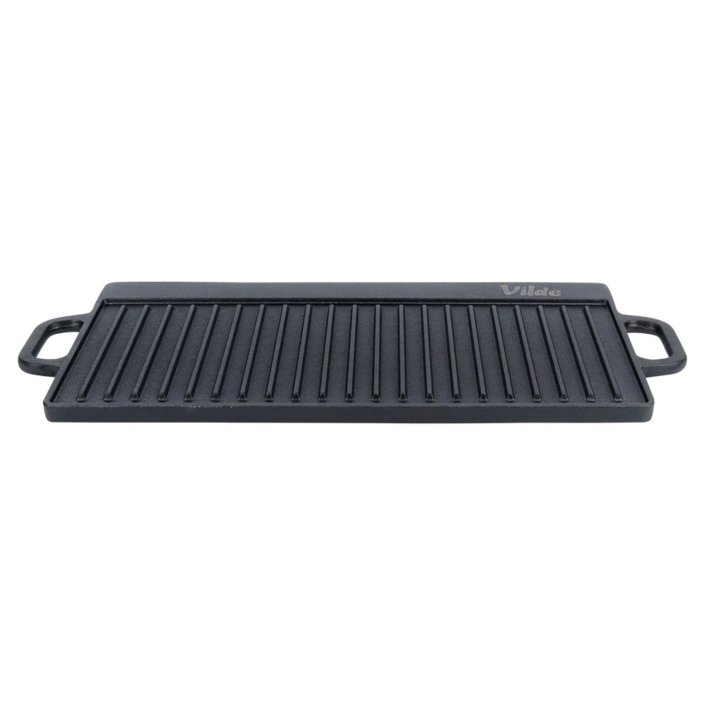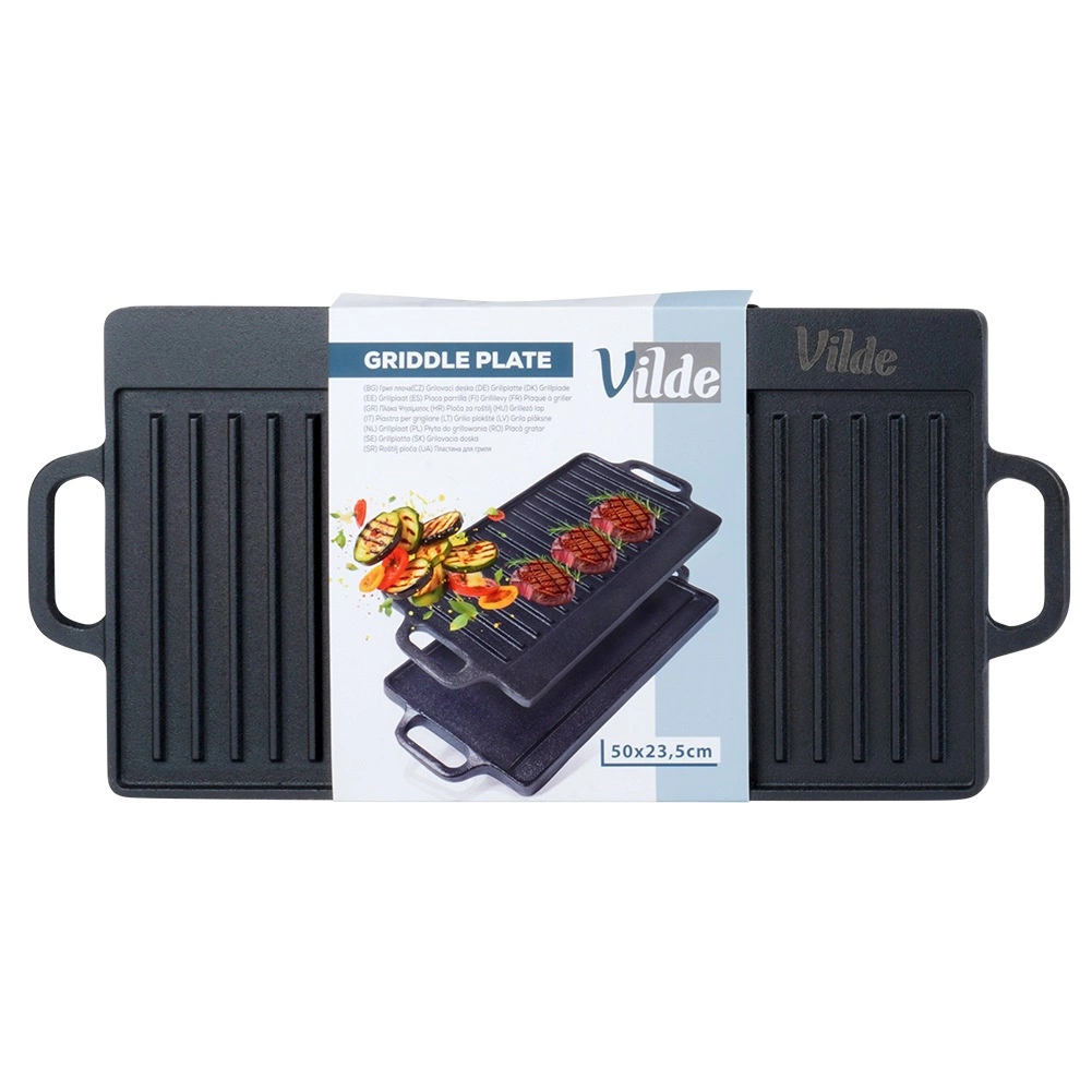 A CAST LINE univerzális, kétoldalas öntöttvas grilllap 50,5 × 23,5 cm méretben egy bordázott és egy sima oldallal rendelkezik, így tökéletes húsok, halak, zöldségek és steakek elkészítéséhez. A masszív öntöttvas kiválóan vezeti a hőt és sokáig tartja, így egyenletes átsülést és gyönyörű sear csíkokat érhet el. Alkalmas grillre, főzőlapra és a sütőbe is.