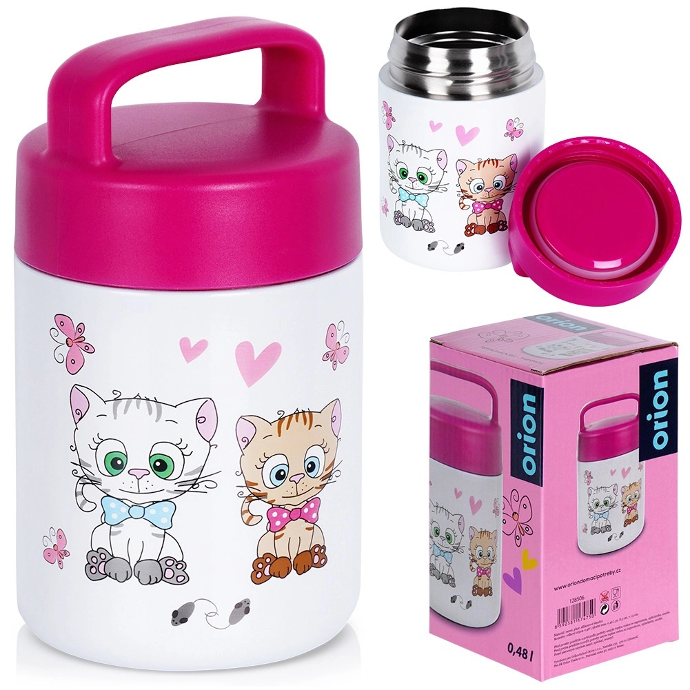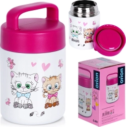 Stílusos gyerek ételes termosz kiscicás mintával, amely megjelenésével és funkcionalitásával is lenyűgöz. A széles száj miatt könnyen tölthető levesekkel, kásákkal, salátákkal vagy gyümölcsös nassolnivalókkal, és a tisztítás is ugyanolyan egyszerű. A rozsdamentes acél tartósságot és higiéniát biztosít, míg a tömítéses fedél megbízhatóan megakadályozza a szivárgást.