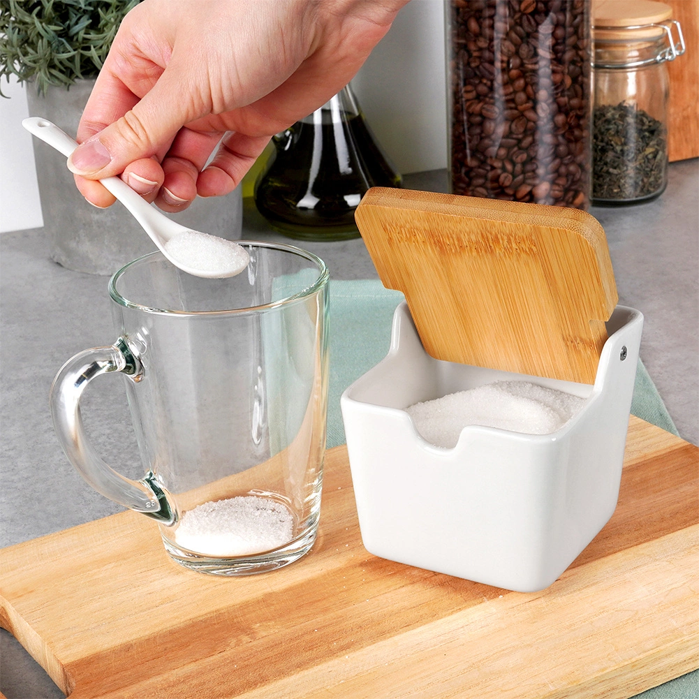 Elegáns, fehér, 250 ml-es cukortartó praktikus bambusz fedéllel és integrált kanálnyílással a kényelmes adagoláshoz. A minőségi kerámia és a természetes bambusz kombinációja tovább frissen és tisztán tartja a tartalmat. Ideális mindennapi használatra konyhában és kávézóban is. Minimalista dizájn, egykezes, könnyű hozzáférés és sokoldalú felhasználás cukorhoz, sóhoz és fűszerekhez.