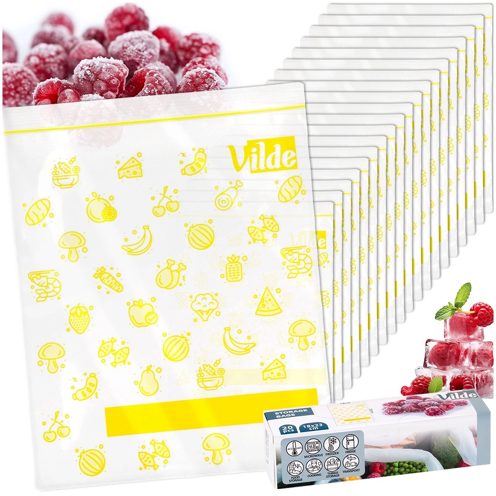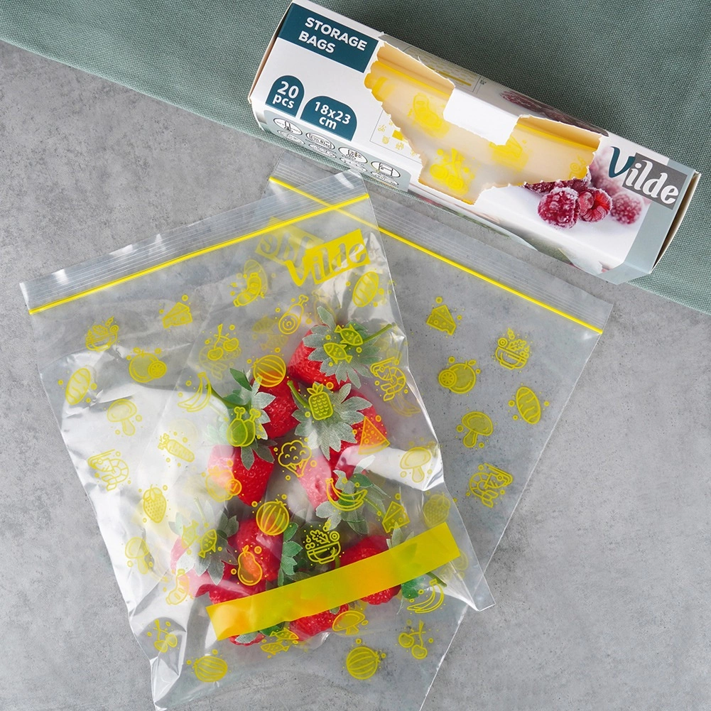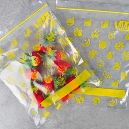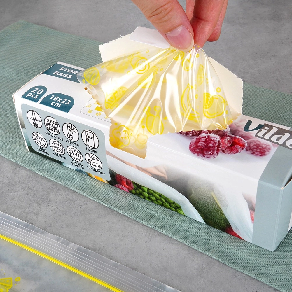 Praktikus, 20 darabos készlet átlátszó, zipzáras tasakokból mindennapi élelmiszer-tároláshoz. A légmentes zárás véd a nedvességtől és a frissesség elvesztésétől, sokoldalúan használható gyümölcshöz, zöldséghez, húshoz vagy uzsonnához. Fagyasztóba és mikrohullámú sütőbe is alkalmas (−45 °C-tól 140 °C-ig). A tartalom feliratozására szolgáló külön mező megkönnyíti a rendszerezést.