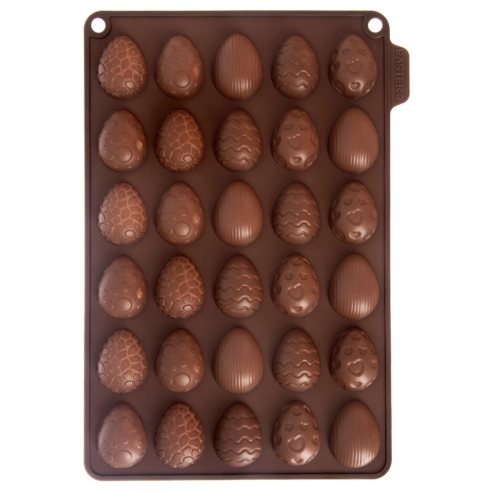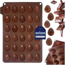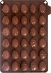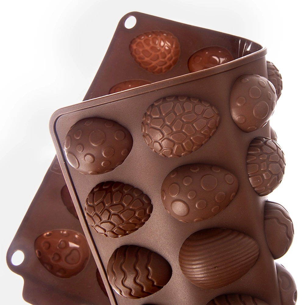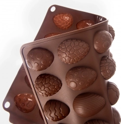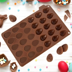 Ez a minőségi, barna szilikon forma megkönnyíti a házi pralinék, csokoládék és apró sütemények tojás alakú elkészítését. A tapadásmentes felületnek köszönhetően a kész darabok könnyen kifordíthatók kenés vagy lisztezés nélkül. A forma könnyű, jól tárolható, és nem veszi át a szagokat vagy ízeket.