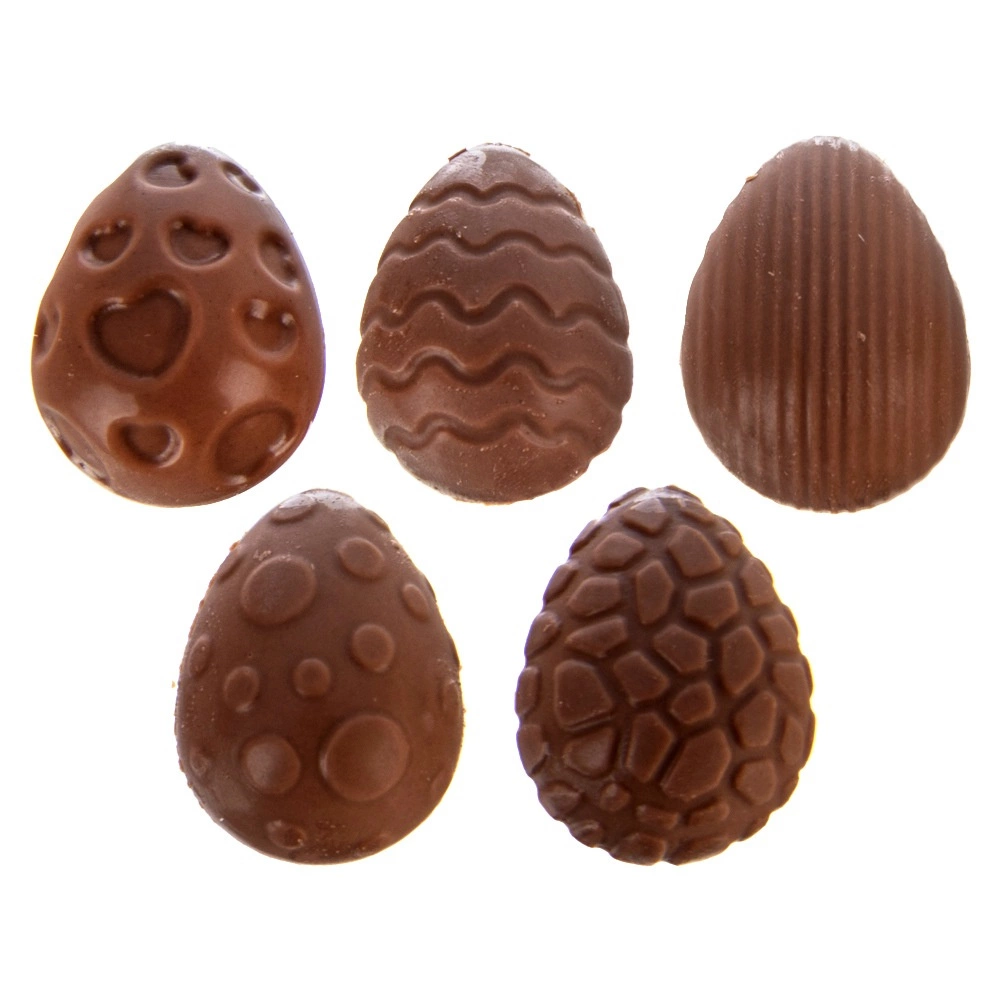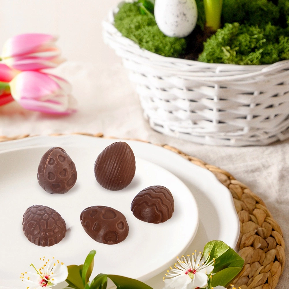 A tojások különböző textúrái és mintái professzionális megjelenést és ünnepi hangulatot kölcsönöznek a házi pralinéknak.