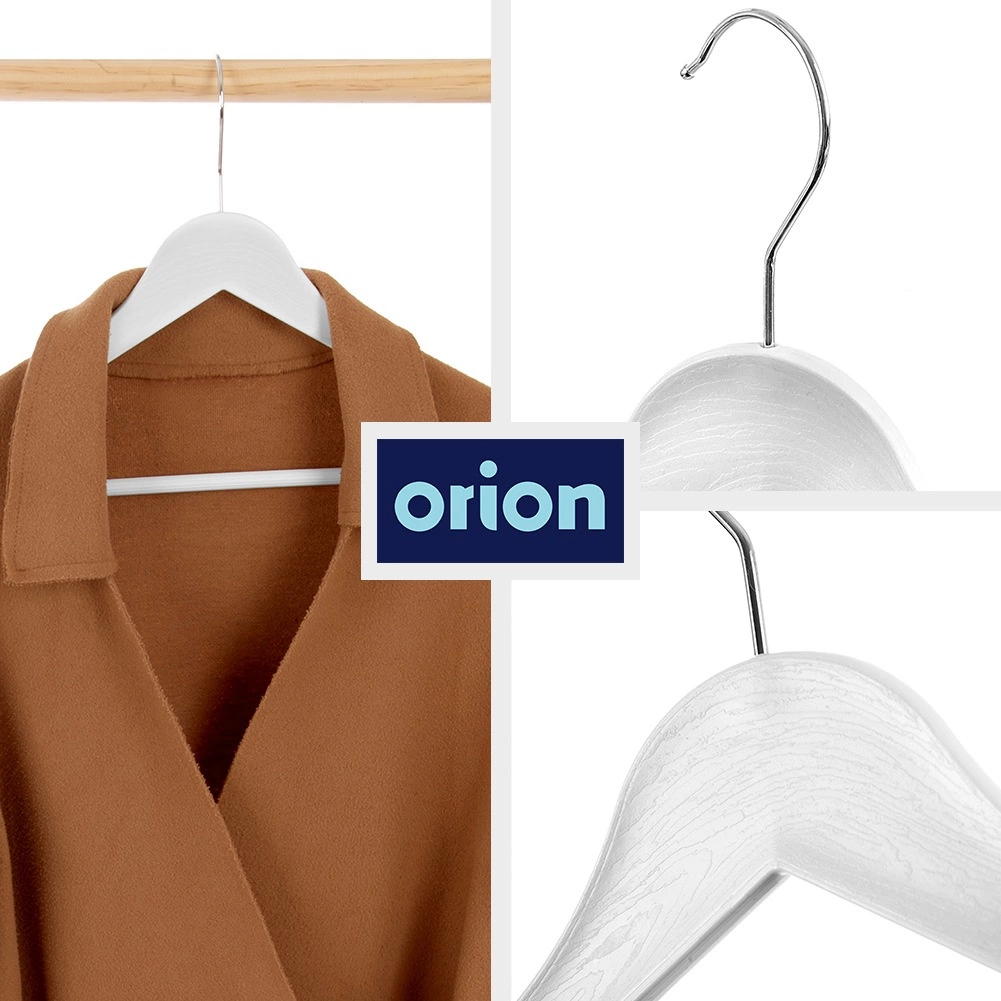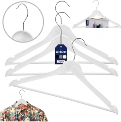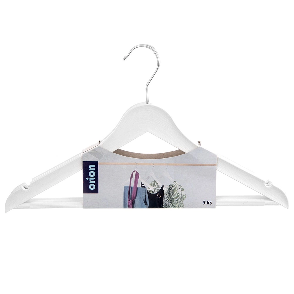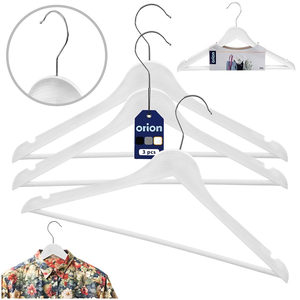 Praktikus, 3 darabos fehér vállfa készlet forgatható kampóval az átlátható szekrényszervezéshez. A fa hatású megjelenés és a fémkampó eleganciát kölcsönöz, a vállfák univerzálisak ingekhez, ruhákhoz és kabátokhoz. Minden vállfa mérete 42,5 × 24 × 1 cm, és a forgatható kampónak köszönhetően a szekrényben való elhelyezés maximálisan kényelmes. Eredeti termék az ORION cseh márkától.