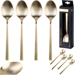 Adjon egy csipetnyi luxust az asztalterítéshez a 4 darabos, selyemfényű arany teáskanál-készlettel. A modern, letisztult vonalak és a kefélt felület remekül illik klasszikus és modern enteriőrökhöz, otthon és kávézókban egyaránt. A tartós rozsdamentes acél élelmiszer-biztonságos és hosszú élettartamot garantál.
