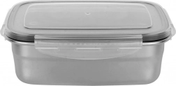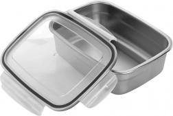 A praktikus, 700 ml-es rozsdamentes acél doboz 17 × 13,5 × 5,5 cm-es mérettel ideális ebédhez, uzsonnához és maradékokhoz. Az átlátszó fedél szilikon tömítéssel és négy erős klipszszel légmentes, szivárgásmentes zárást biztosít, így a tartalom tovább friss marad.