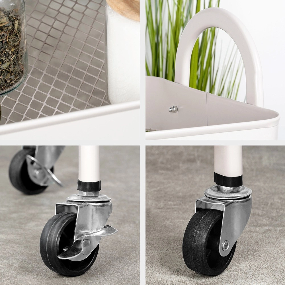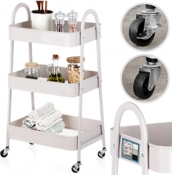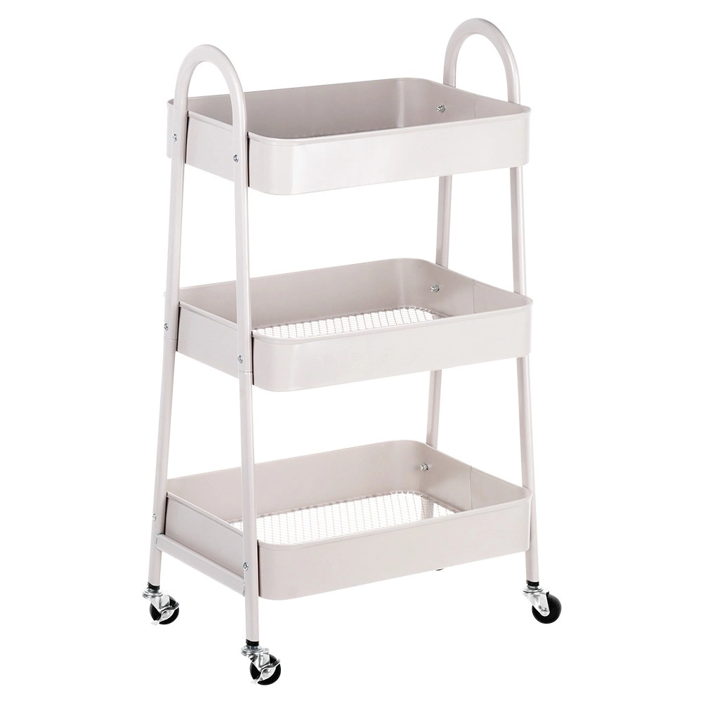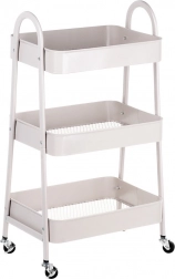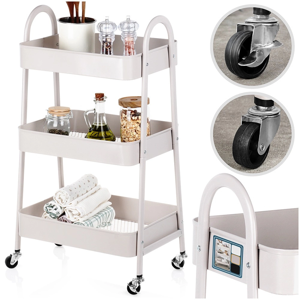 Ez a többfunkciós gurulós állvány a funkcionalitást, a tartósságot és az esztétikát ötvözi. A három mély, megemelt peremű kosár mindent a helyén tart – a konyhai élelmiszerektől és fűszerektől kezdve egészen a kozmetikumokig és törölközőkig a fürdőszobában. Az elegáns bézs színű fém kivitel könnyen illeszthető a modern belső terekhez, a simán gördülő kerekekkel pedig az állványt könnyedén oda tolhatja, ahol épp szükség van rá.