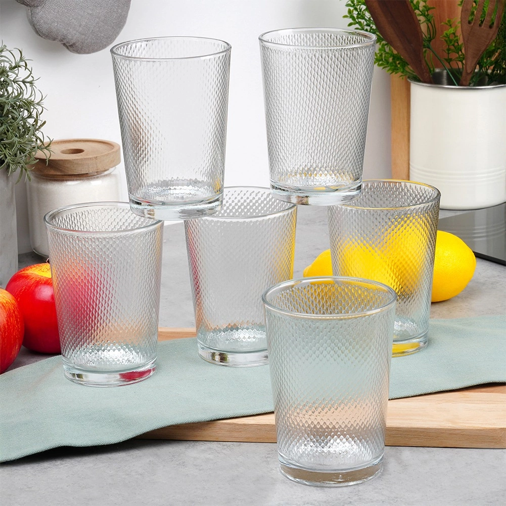 Elegáns, hatdarabos pohárszett 425 ml űrtartalommal, átlátszó, vastagfalú üvegből, strukturált felülettel a biztos fogásért. Ideális vízhez, limonádéhoz, dzsúzokhoz és italokhoz, mosogatógépben mosható, és kiváló mindennapi használatra otthon és a vendéglátásban is.