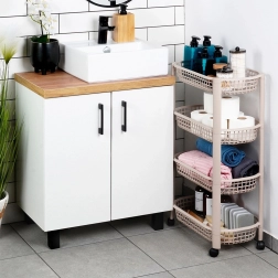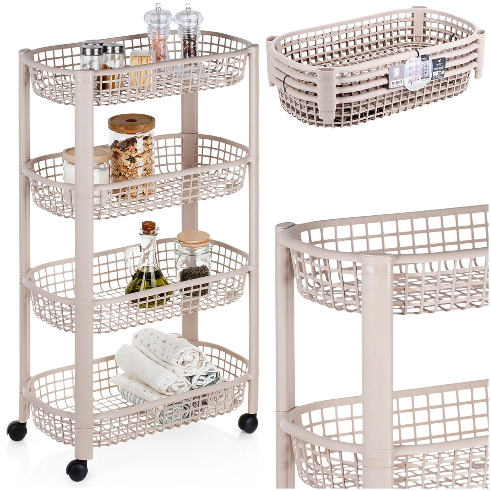 Masszív, mégis könnyű, tartós műanyag kivitel egyszerű összeszereléssel és stabilitással. A négy forgó keréknek (kettő fékkel) köszönhetően a polcot könnyedén oda gurítja, ahol épp szükség van rá, majd biztonságosan rögzíti. A minimalista bézs dizájn természetesen illeszkedik bármely enteriőrbe.