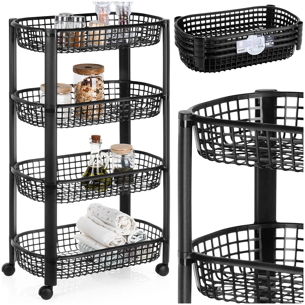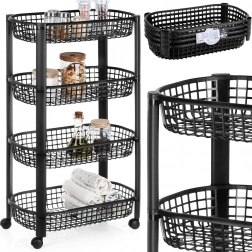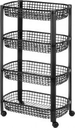Praktikus, keskeny profilú négyszintes guruló állvány, amely mobil tárolóhelyet kínál konyhába, fürdőszobába, irodába és műhelybe. Könnyű, mégis stabil felépítés tartós műanyagból, négy szellőző kosárral és fékezhető kerekekkel az egyszerű áthelyezéshez és a biztos rögzítéshez. Ideális élelmiszerek, kozmetikumok, tisztítószerek és egyéb háztartási kiegészítők rendszerezéséhez.