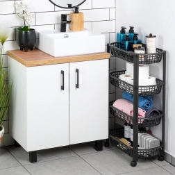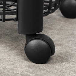 Maximalizálja a tárolóhelyet kis alapterületen. A 46,5 × 26 × 79 cm méretű karcsú állvány négy praktikus kosárral (46,5 × 26 × 7,5 cm) rendelkezik, melyek nyitott rácsszerkezetüknek köszönhetően átláthatóságot és szellőzést biztosítanak. A négy kerék révén a kocsi könnyedén mozgatható a helyiségek között; két kerék fékkel van ellátva a biztonságos rögzítéshez.