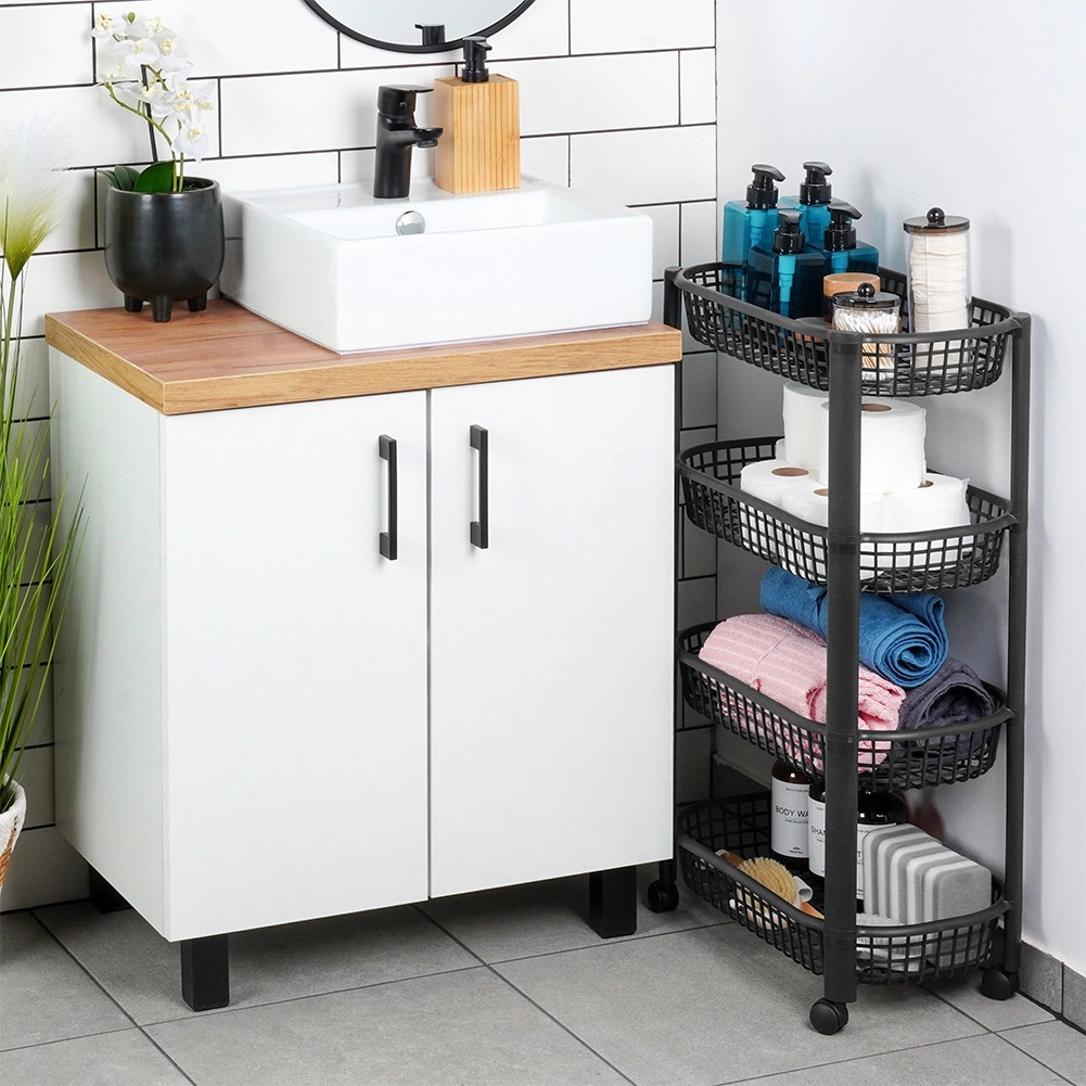 Négy mély kosár bőséges helyet biztosít, miközben a keskeny alapterület minden centimétert megspórol a padlón – ideális konyhába, fürdőbe és kamrába.