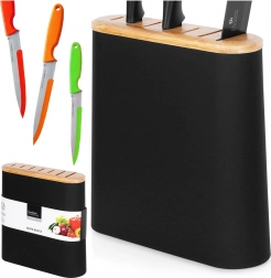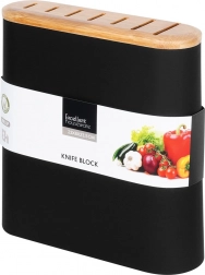 Stílusos és funkcionális késállvány 23 × 8 × 23,5 cm méretben, amely áttekinthető, biztonságos és higiénikus tárolást biztosít az acél, a kerámia és a kombinált kések számára. A matt fekete test kellemes soft touch felülettel és a felső bambusz rész nyílásokkal időtálló kiegészítője bármely konyhának.