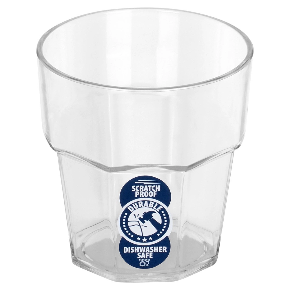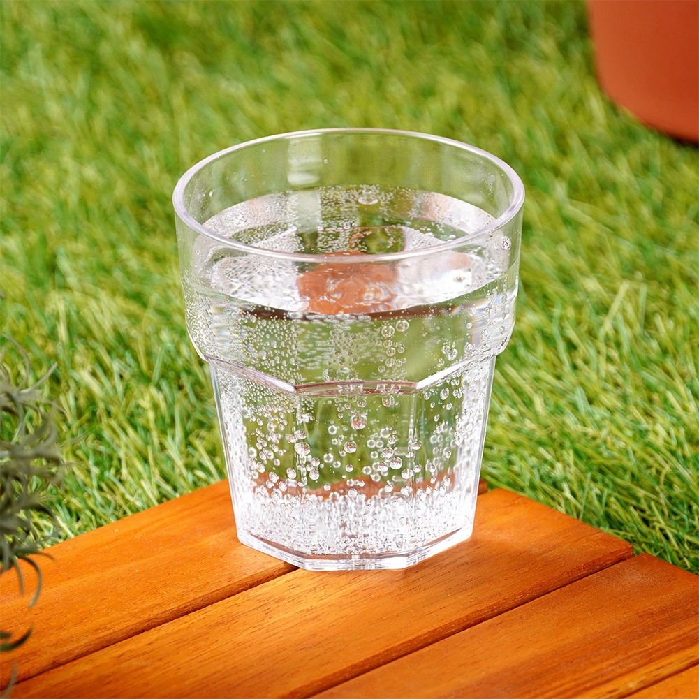 Praktikus, 275 ml űrtartalmú pohár, kb. 8,5 cm magassággal és 8 cm átmérővel, minőségi, átlátszó akrilból. Elegáns, üvegszerű megjelenést kínál, a fokozott törésállóság előnyével. Tökéletes vízhez, limonádéhoz, gyümölcslevekhez, koktélokhoz és jeges teához.