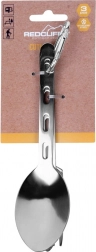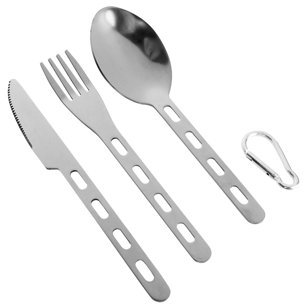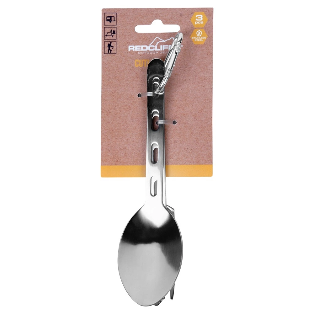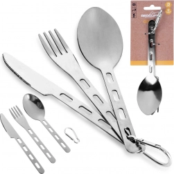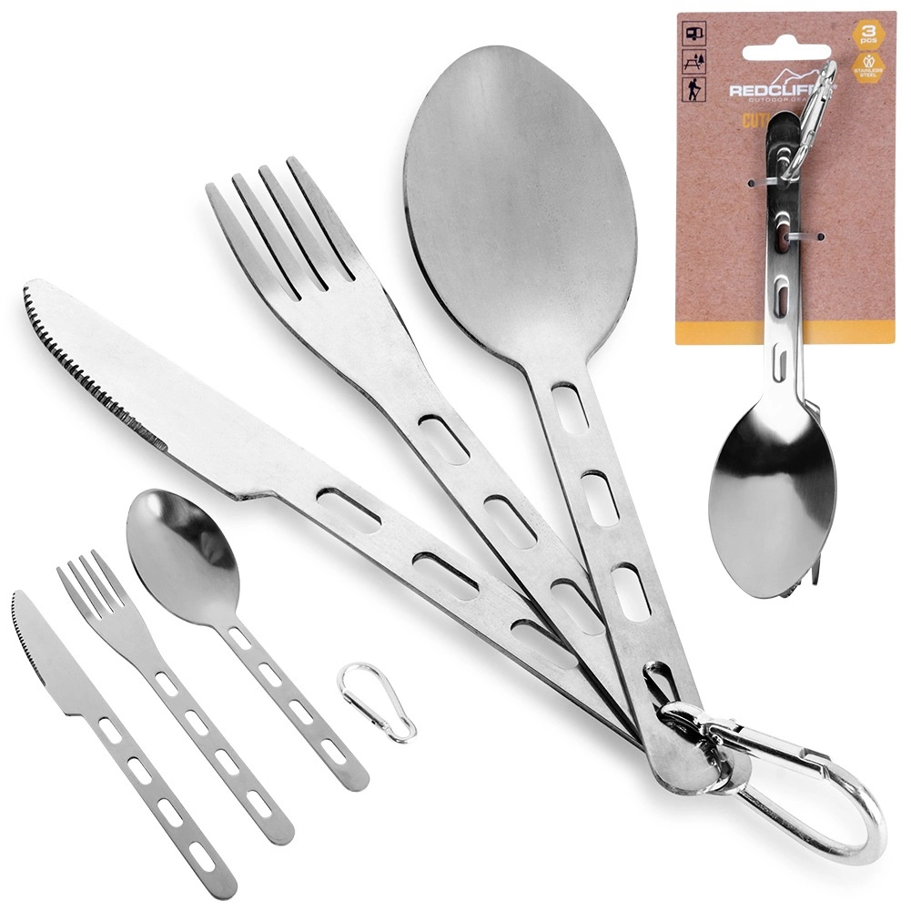 A túra evőeszköz készlet megbízható társ minden szabadtéri kalandhoz. A rozsdamentes acélnak köszönhetően korrózióálló, masszív és könnyen karbantartható. A három darabot praktikus karabiner tartja egyben, amely megkönnyíti a hátizsákra vagy övre akasztást, és megelőzi az egyes darabok elvesztését.