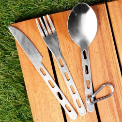 Teljes értékű kanál, villa és fogazott élű kés a könnyű szeleteléshez, hogy bárhol a szabadban kényelmesen étkezhessen.