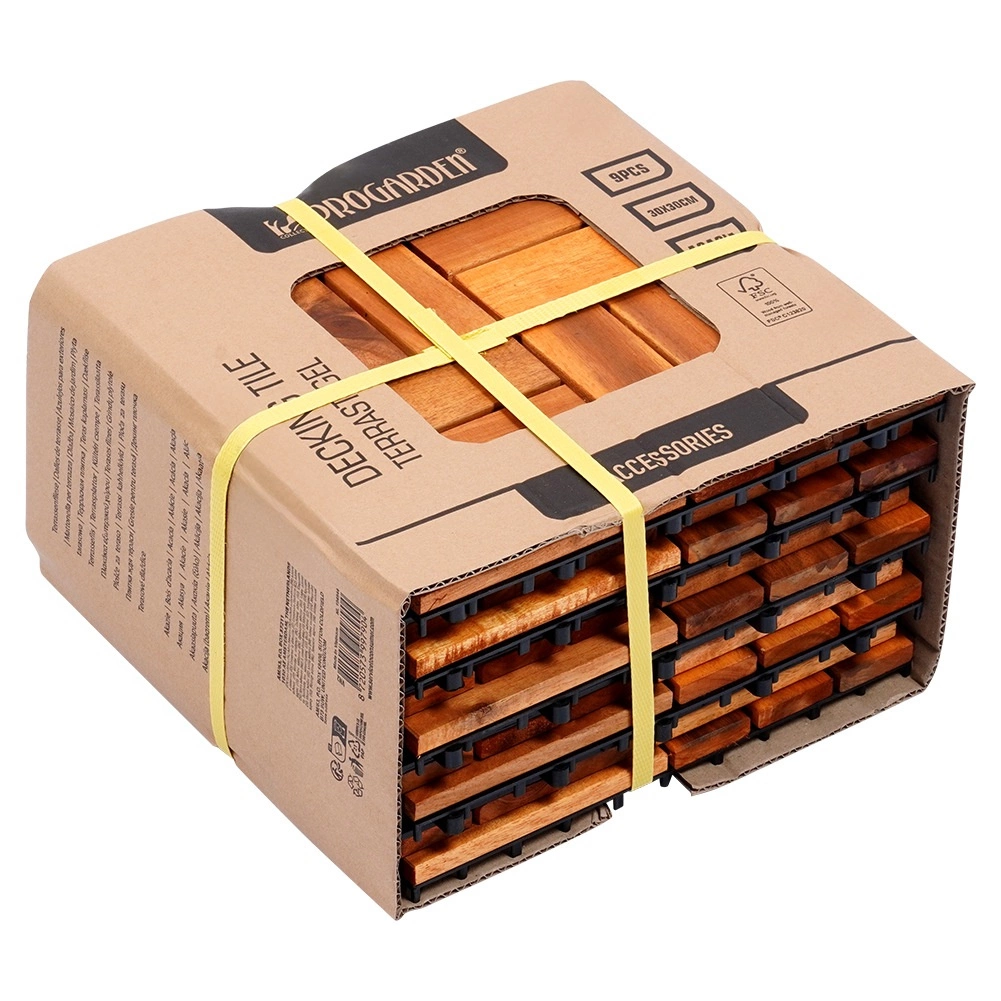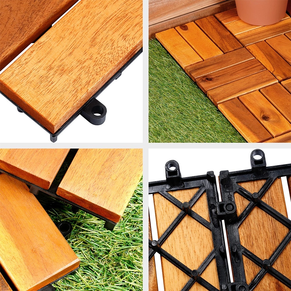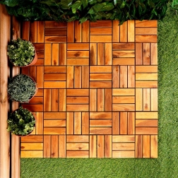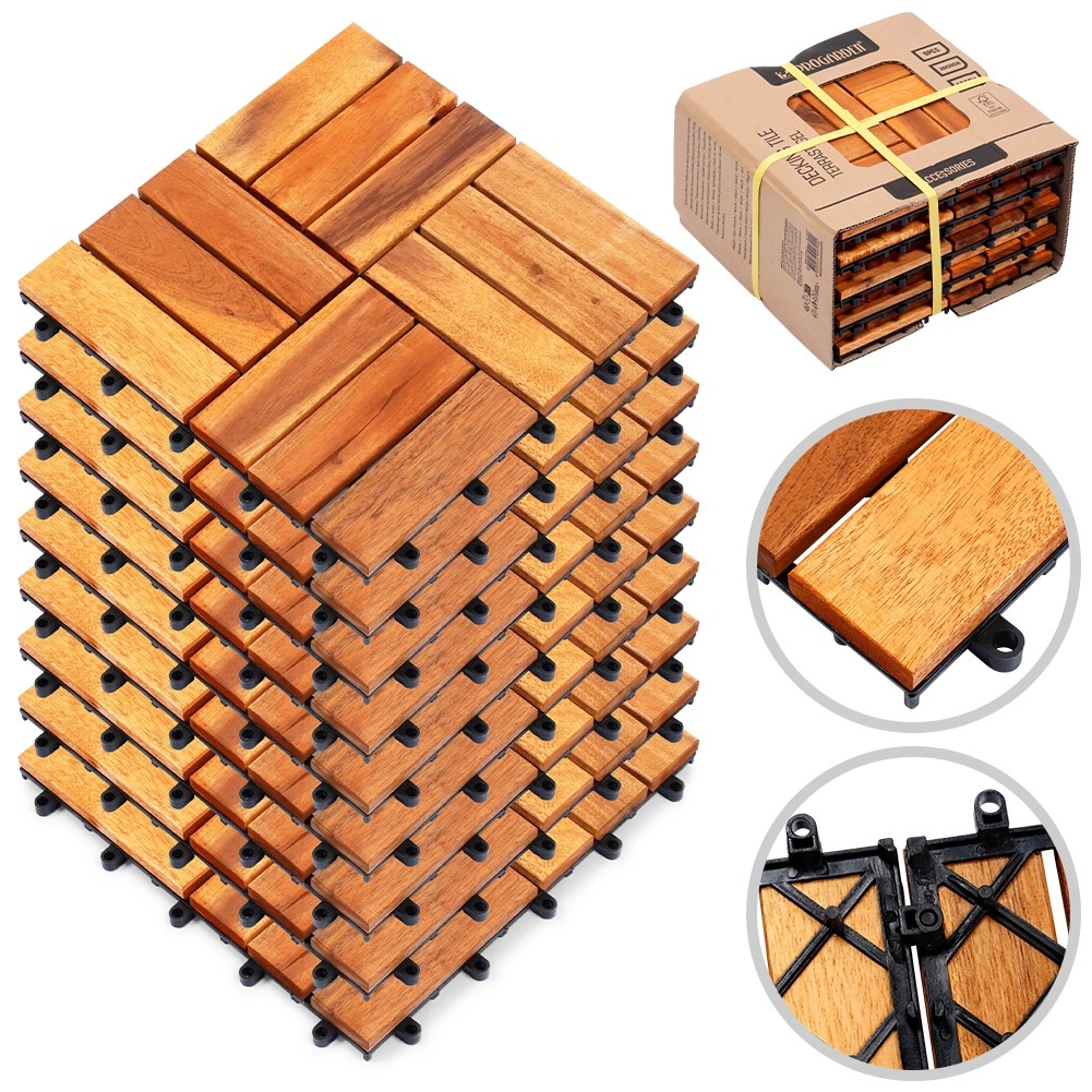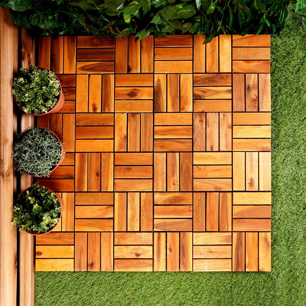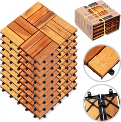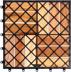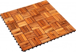 Ezek a fa teraszburkoló lapok meghitt, stílusos térré alakítják erkélyét, teraszát vagy kerti pihenősarkát. A meleg barna árnyalatú, minőségi akácfa felület természetes megjelenést ad, míg a műanyag rácsos alap stabilitásról, vízelvezetésről és szellőzésről gondoskodik.