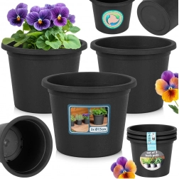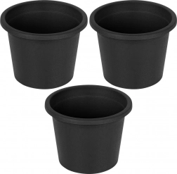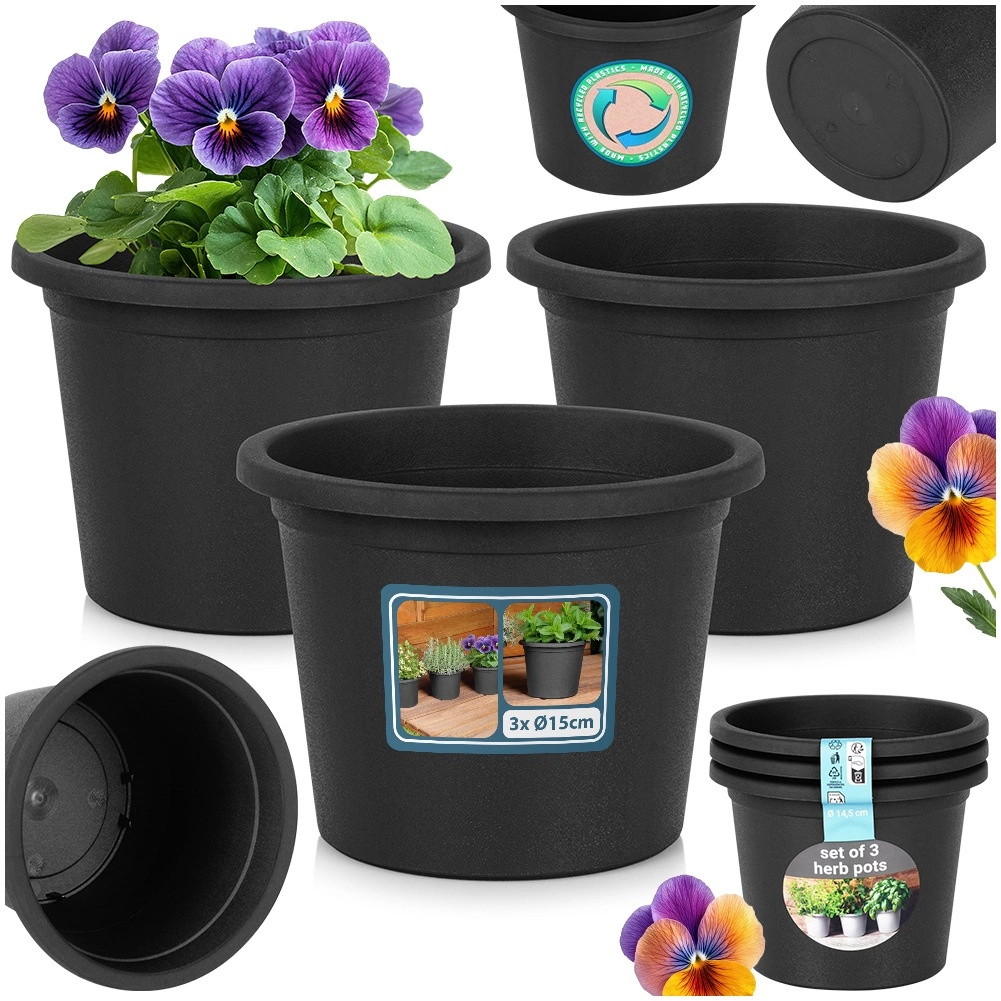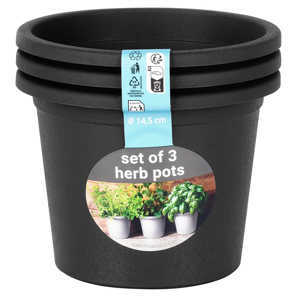 Praktikus, három darabos fekete virágcserép-készlet 14,5 cm átmérővel, fűszernövényekhez és virágokhoz, beltérre és kültérre. Könnyű, tartós és újrahasznosított műanyagból, elegáns kerek formával és egész éves időjárásállósággal erkélyre, teraszra, kertbe és otthonra.