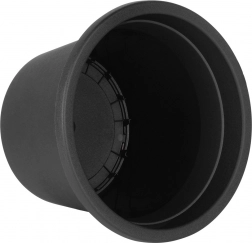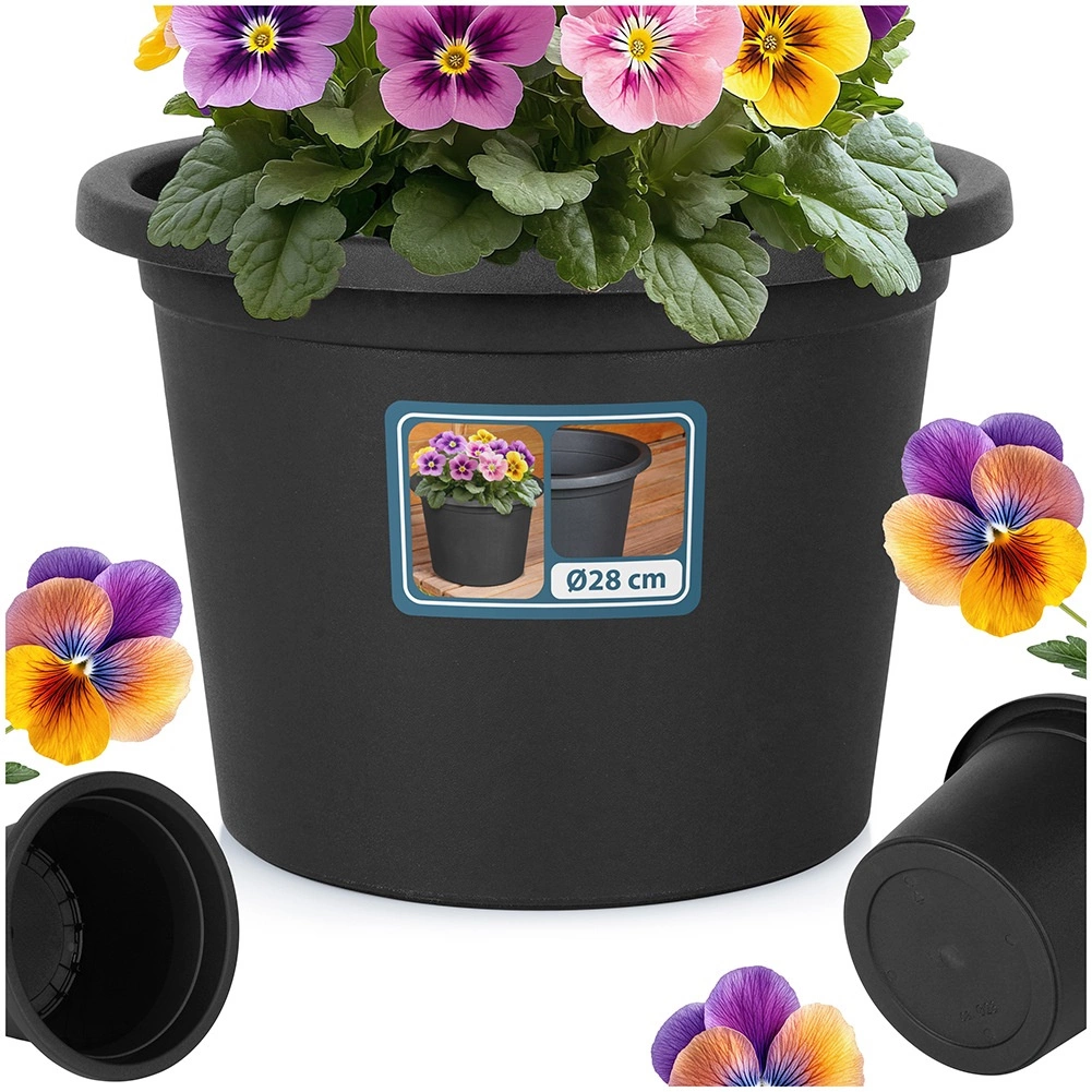 A fekete, kerek virágcserép 27,5 cm átmérővel és 19,5 cm magassággal ideális választás egész éves kültéri használatra. Elegendő helyet biztosít a növények növekedéséhez, a masszív perem és a keskenyedő oldalak pedig elegáns és stabil megjelenést kölcsönöznek. Alkalmas önálló cserépként és dekoratív kaspóként betétedényekhez.